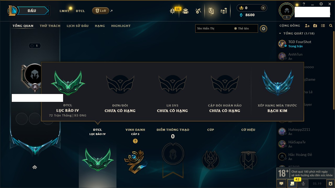Rank Đơn: Lục Bảo IVKhung: VàngTướng: 171 - Còn 154648 THXTrang Phục: 203Rank ĐTCL: Bạch Kim IVLinh Thú: 69
