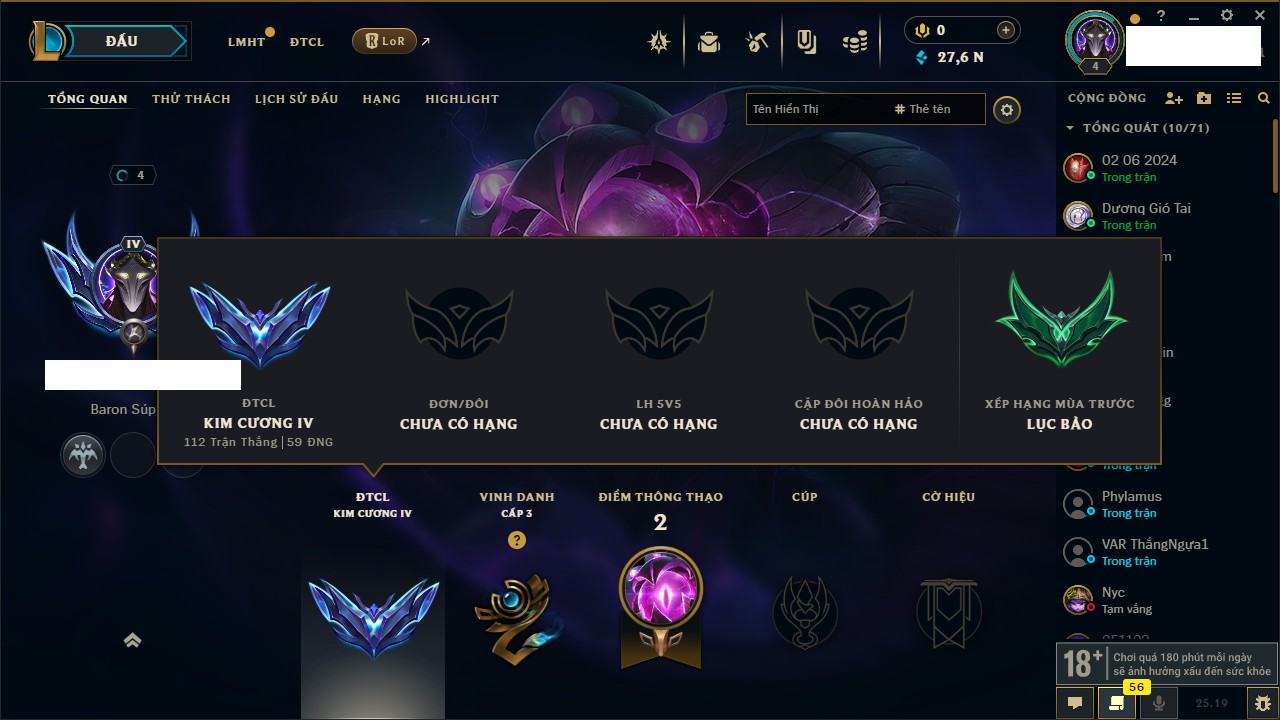 Rank Đơn: Chưa RankKhung: Chưa có khungTướng: 118 - Còn 13712 THXTrang Phục: 117Rank ĐTCL: Chưa RankLinh Thú: 34