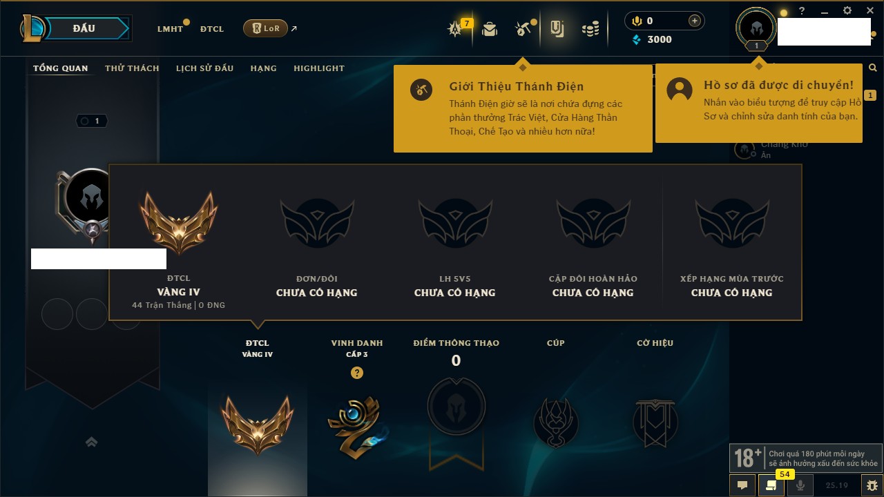 Rank Đơn: Chưa rank mùa nàoKhung: Chưa có khungTướng: 0 - Còn 4000 THXTrang Phục: 0Rank ĐTCL: Đồng ILinh Thú: 18