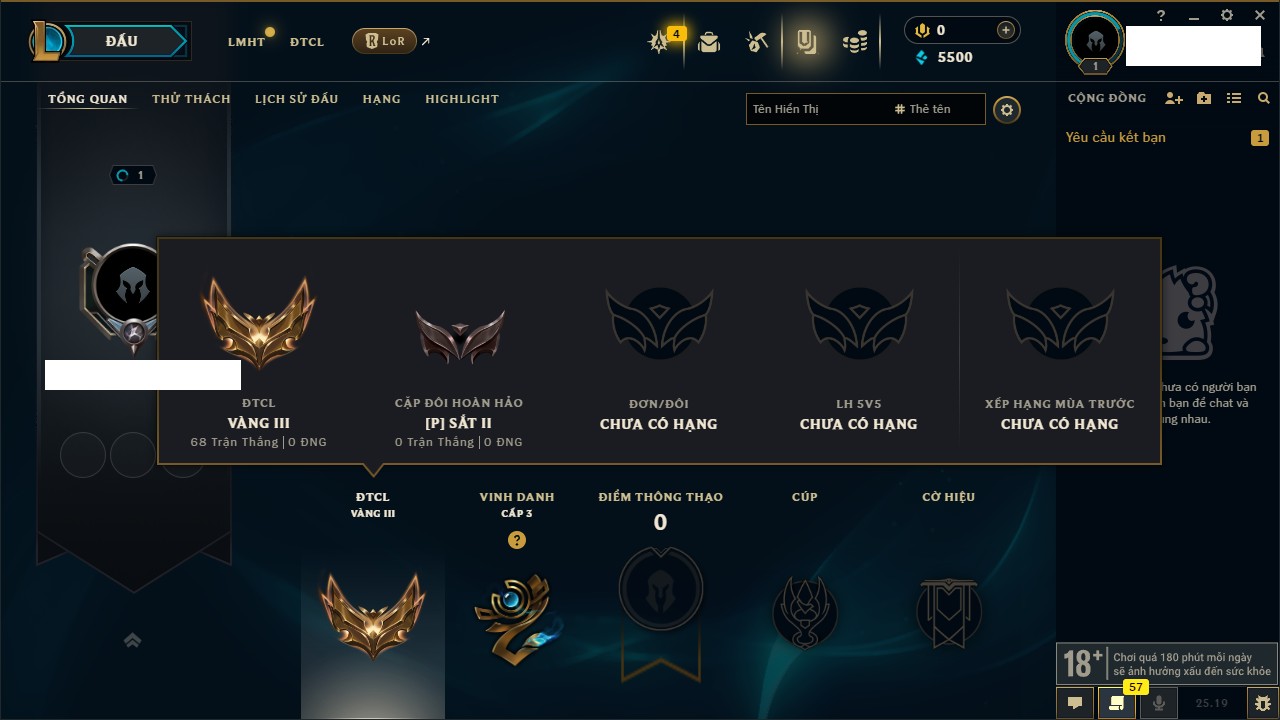 Rank Đơn: Chưa rank mùa nàoKhung: Chưa có khungTướng: 0 - Còn 9500 THXTrang Phục: 0Rank ĐTCL: Chưa RankLinh Thú: 38
