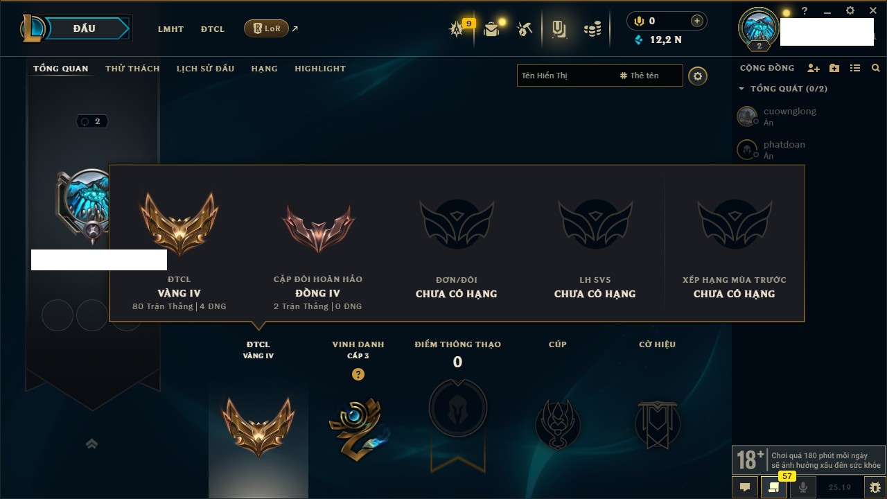 Rank Đơn: Chưa rank mùa nàoKhung: Chưa có khungTướng: 2 - Còn 12250 THXTrang Phục: 0Rank ĐTCL: Vàng IVLinh Thú: 14