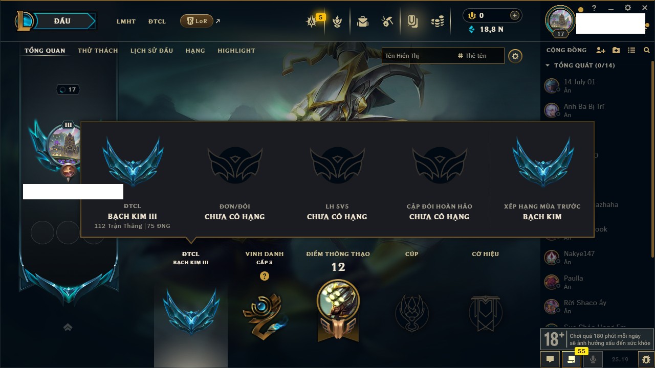 Rank Đơn: Bạc IIKhung: Bạch kimTướng: 169 - Còn 81813 THXTrang Phục: 301Rank ĐTCL: Chưa RankLinh Thú: 140