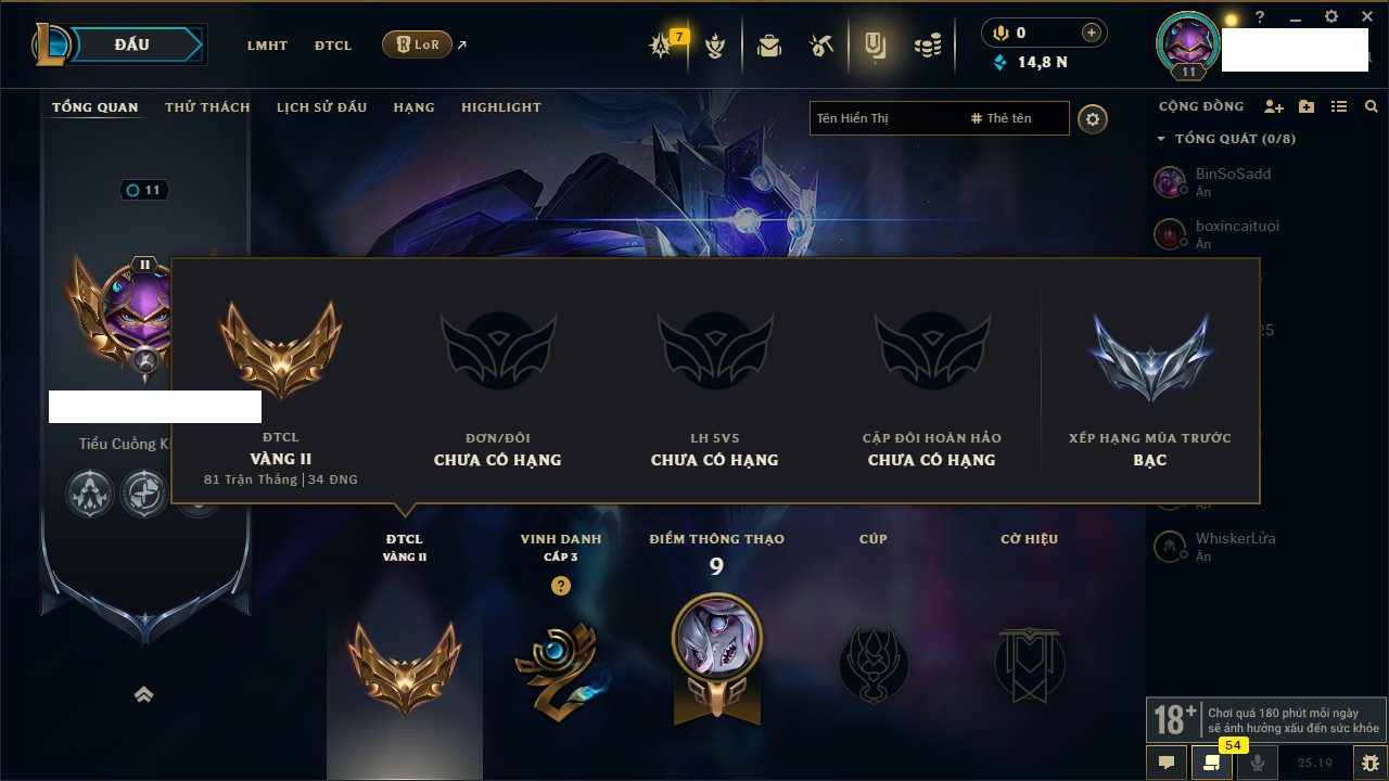 Rank Đơn: Chưa rank mùa nàoKhung: Chưa có khungTướng: 0 - Còn 6300 THXTrang Phục: 0Rank ĐTCL: Bạc IIILinh Thú: 3