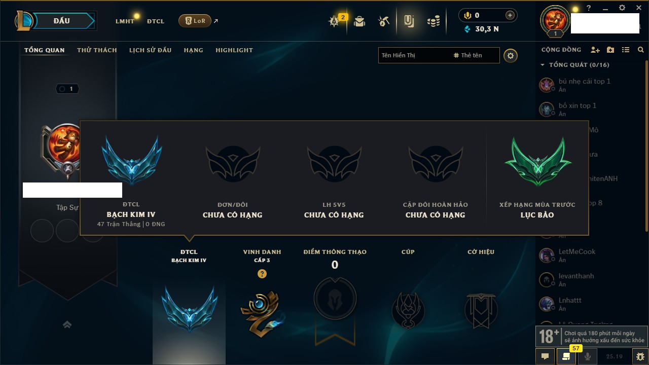 Rank Đơn: Chưa rank mùa nàoKhung: Chưa có khungTướng: 3 - Còn 34550 THXTrang Phục: 0Rank ĐTCL: Bạch Kim IVLinh Thú: 41