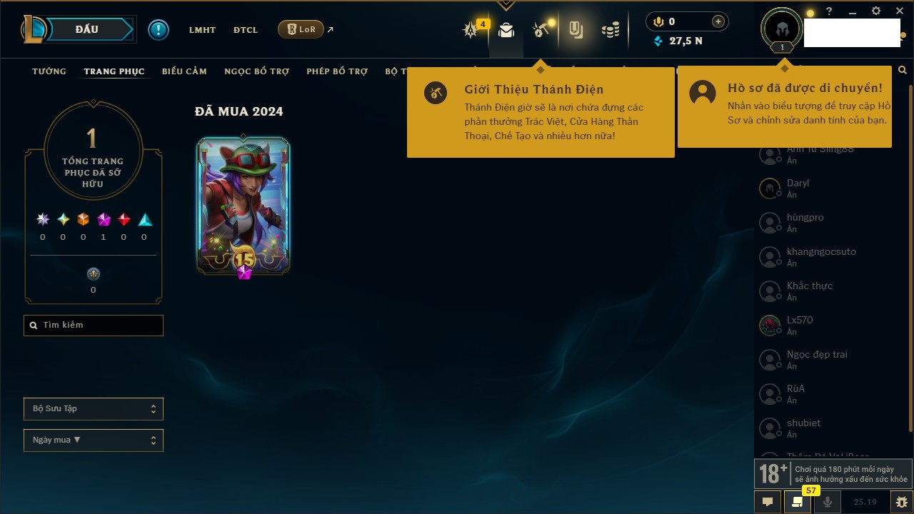 Rank Đơn: Đồng IIKhung: ĐồngTướng: 170 - Còn 66145 THXTrang Phục: 215Rank ĐTCL: Chưa RankLinh Thú: 52