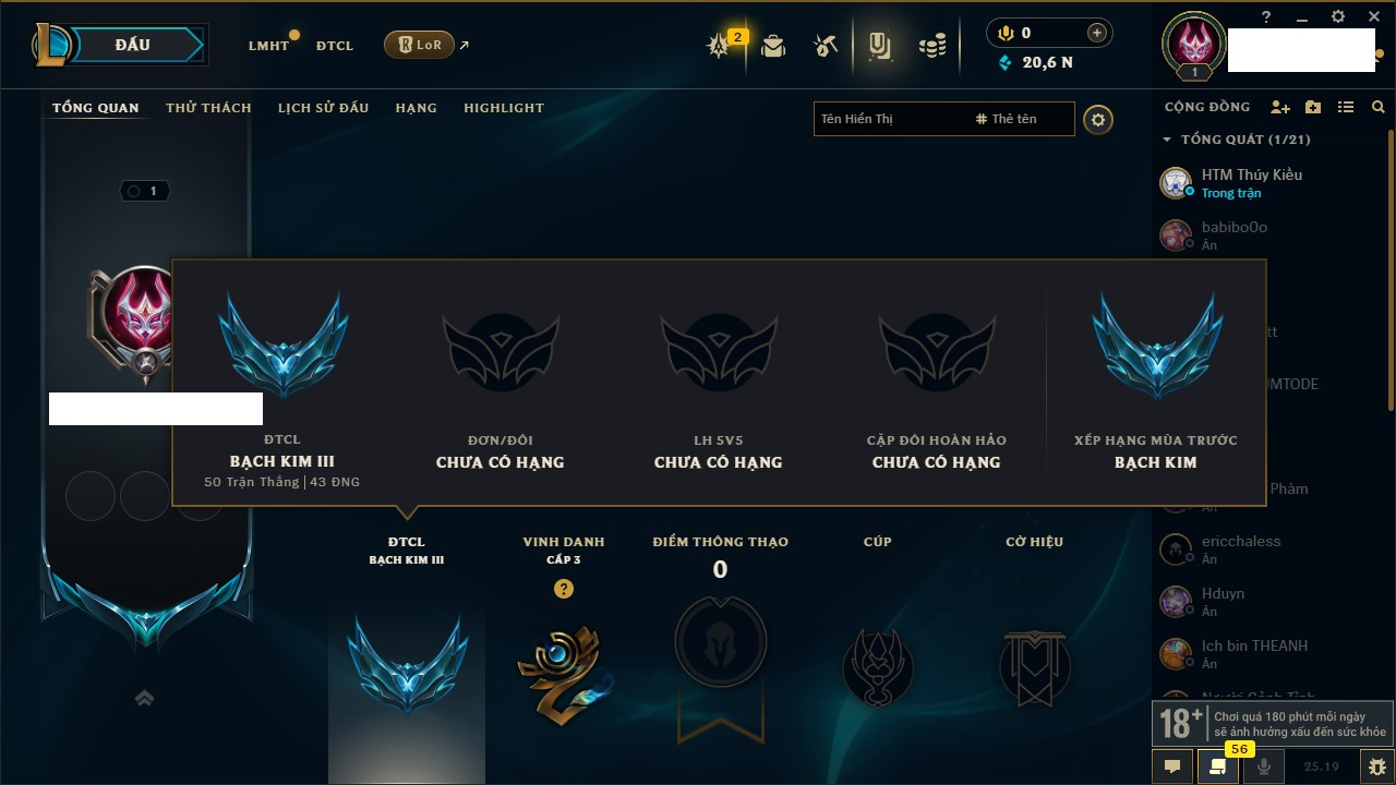Rank Đơn: Chưa rank mùa nàoKhung: Chưa có khungTướng: 4 - Còn 12000 THXTrang Phục: 0Rank ĐTCL: Bạch Kim IIILinh Thú: 20