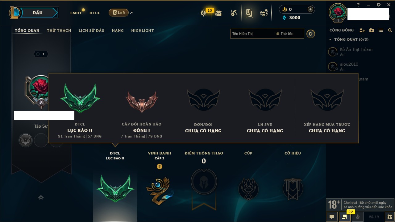 Rank Đơn: Chưa rank mùa nàoKhung: Chưa có khungTướng: 4 - Còn 12000 THXTrang Phục: 0Rank ĐTCL: Bạch Kim IIILinh Thú: 20