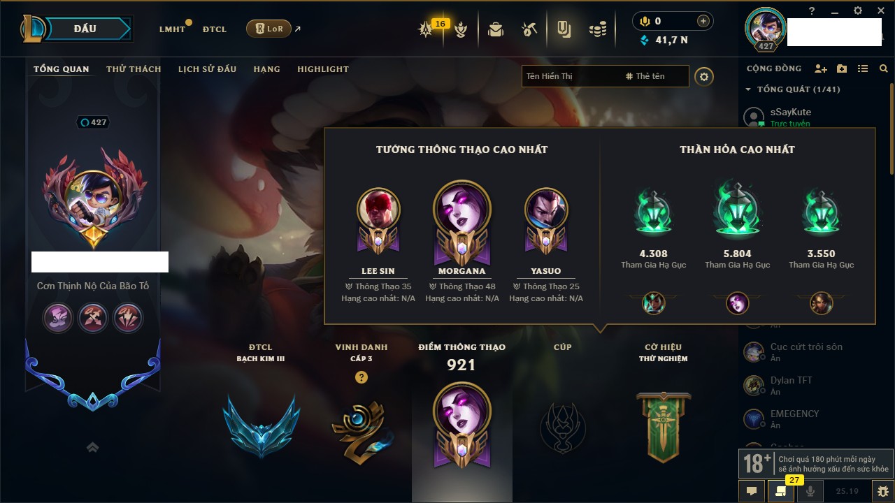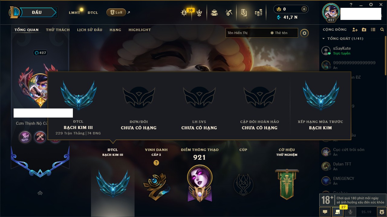 Rank Đơn: Chưa Rank Khung: Bạch kim Tướng: 170 - Còn 34575 THX Trang Phục: 220 Rank ĐTCL: Chưa Rank Linh Thú: 178