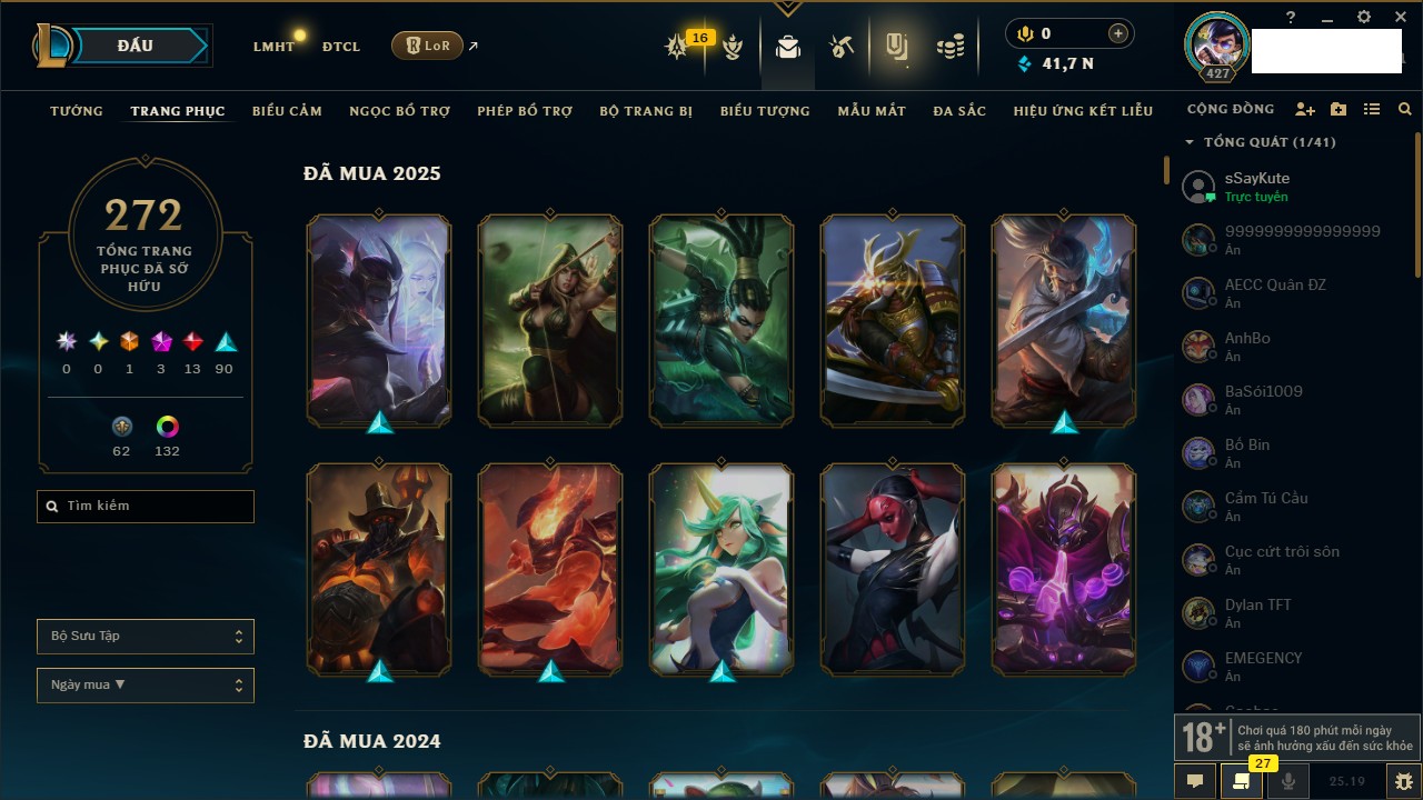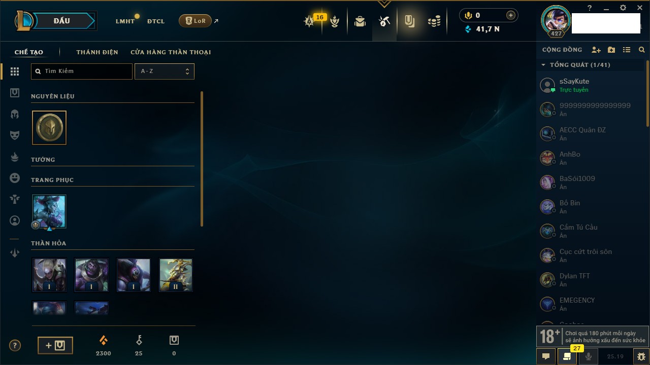 Rank Đơn: Chưa rank mùa nào Khung: Chưa có khung Tướng: 41 - Còn 11257 THX Trang Phục: 11 Rank ĐTCL: Chưa rank mùa nào Linh Thú: 84