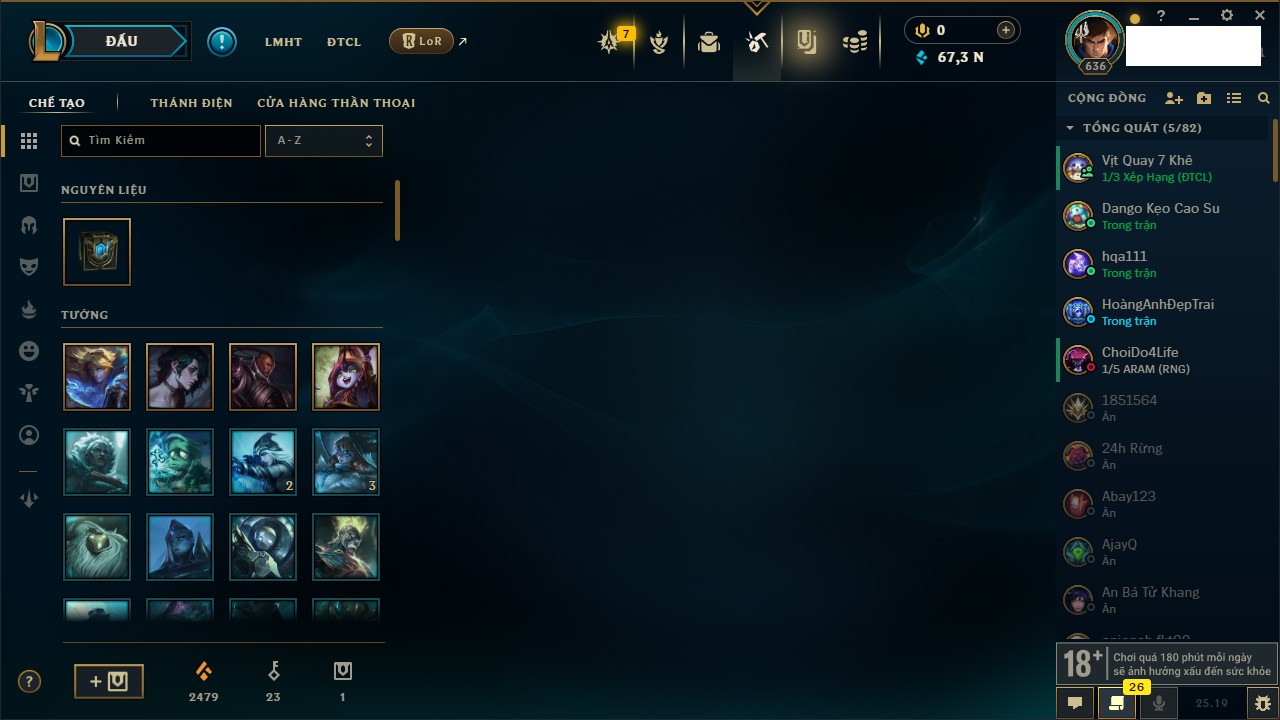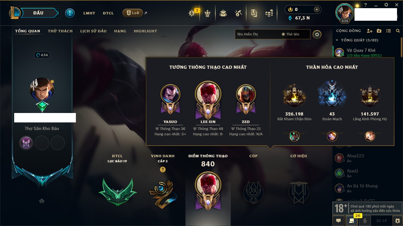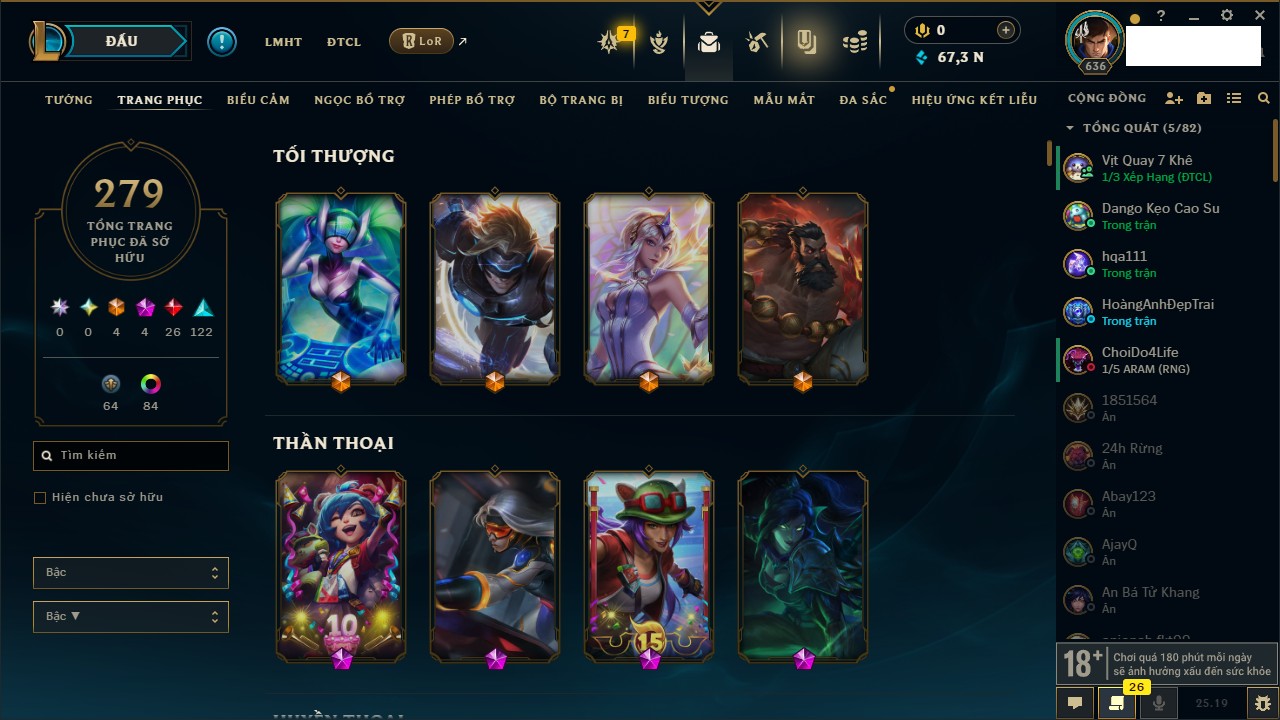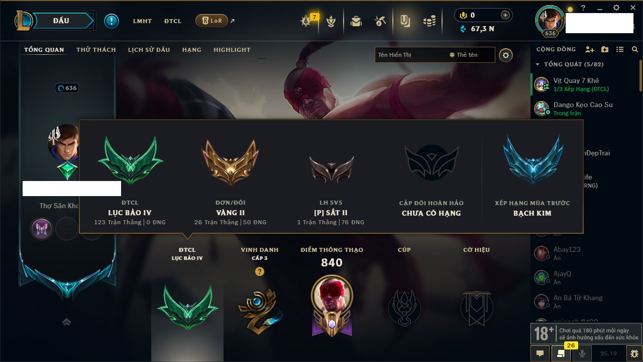 Rank Đơn: Vàng IKhung: BạcTướng: 171 - Còn 60584 THXTrang Phục: 286Rank ĐTCL: Vàng IIILinh Thú: 117