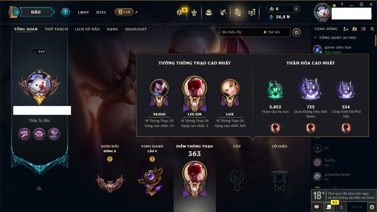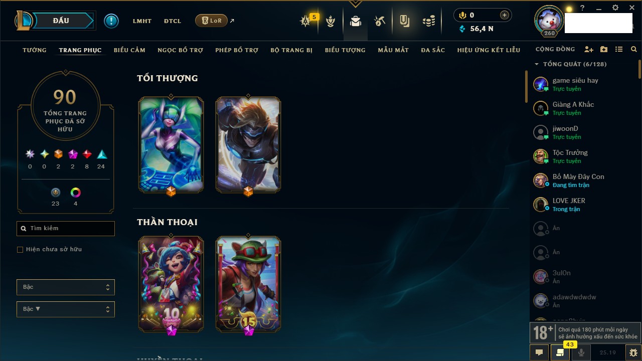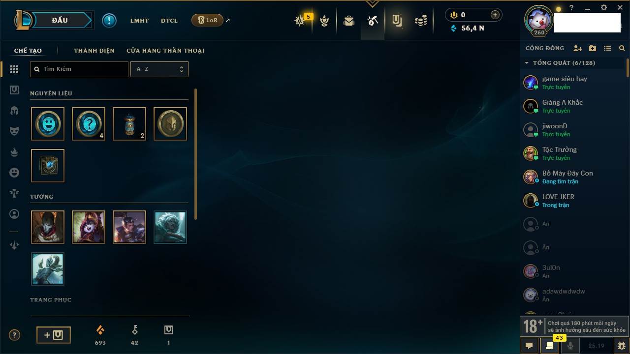 Rank Đơn: Đồng IIKhung: Chưa có khungTướng: 170 - Còn 56487 THXTrang Phục: 90Rank ĐTCL: Chưa RankLinh Thú: 129
