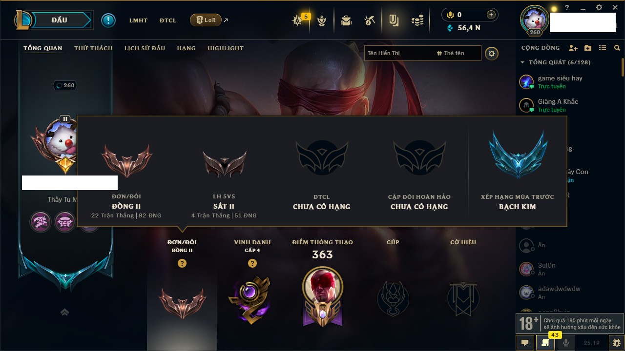 Rank Đơn: Đồng IIIKhung: ĐồngTướng: 171 - Còn 54778 THXTrang Phục: 96Rank ĐTCL: Bạch Kim IIILinh Thú: 140