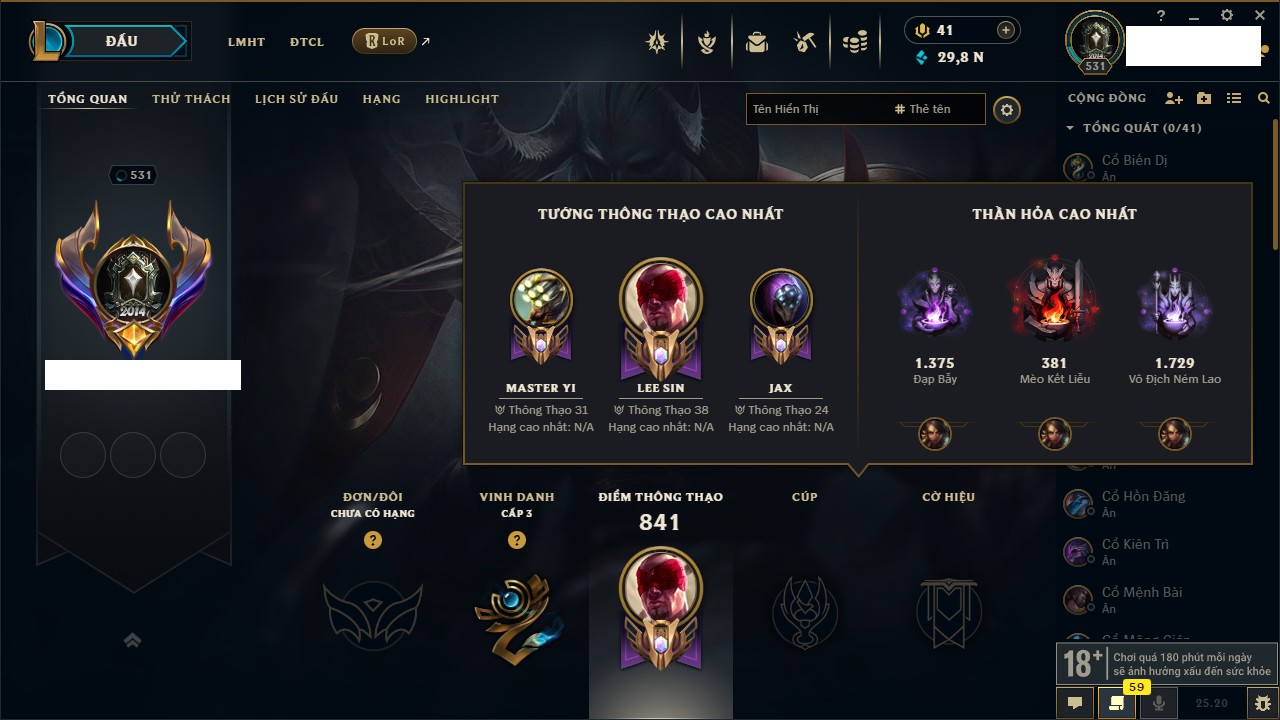 Rank Đơn: Chưa RankKhung: Chưa có khungTướng: 157 - Còn 6783 THXTrang Phục: 50Rank ĐTCL: Chưa RankLinh Thú: 37