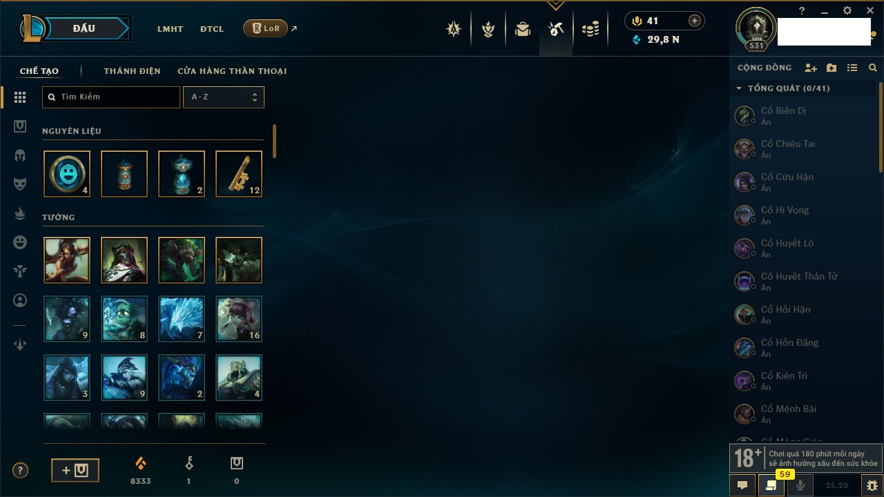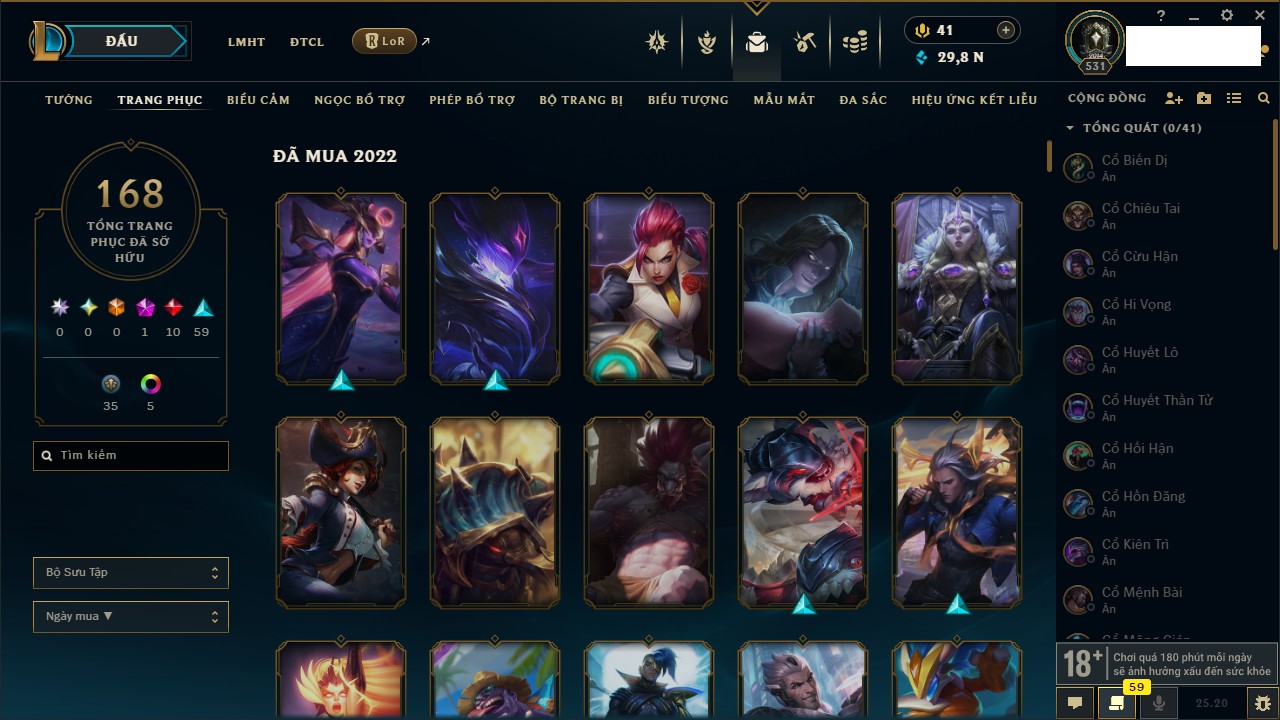 Rank Đơn: Đồng IIKhung: Chưa có khungTướng: 170 - Còn 56487 THXTrang Phục: 90Rank ĐTCL: Chưa RankLinh Thú: 129
