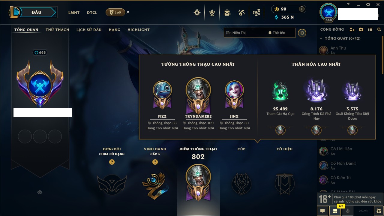 Rank Đơn: Bạch Kim IIKhung: Bạch kimTướng: 171 - Còn 315217 THXTrang Phục: 238Rank ĐTCL: Bạch Kim ILinh Thú: 116