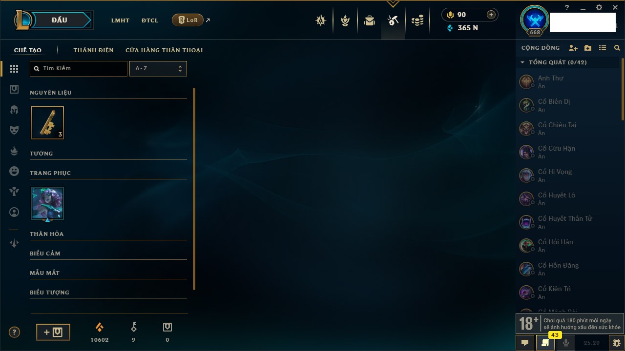 Rank Đơn: Lục Bảo IVKhung: VàngTướng: 171 - Còn 154648 THXTrang Phục: 203Rank ĐTCL: Bạch Kim IVLinh Thú: 69