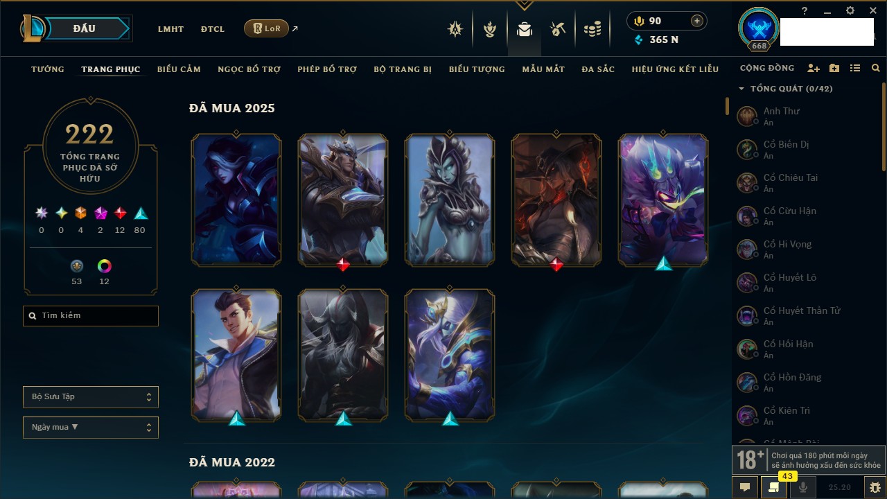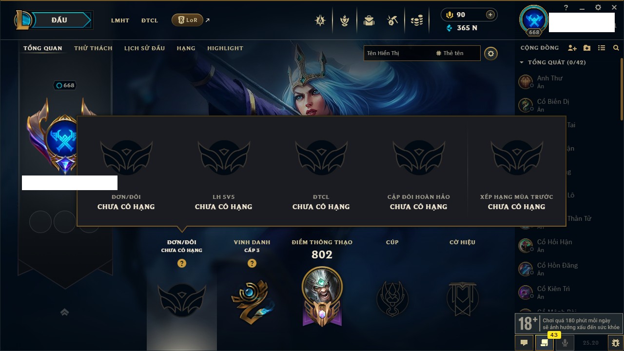 Rank Đơn: Vàng IIIKhung: VàngTướng: 172 - Còn 164704 THXTrang Phục: 255Rank ĐTCL: Kim Cương IVLinh Thú: 156