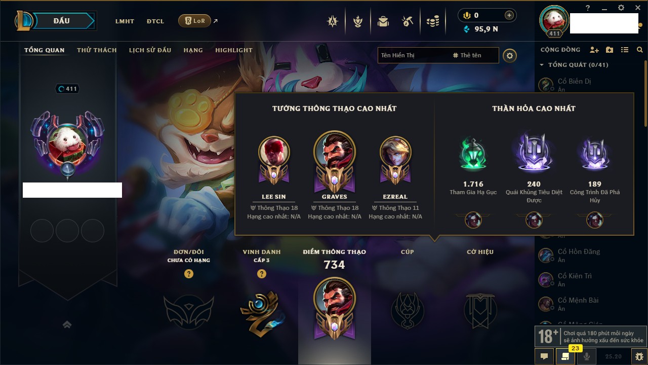 Rank Đơn: Chưa RankKhung: Chưa có khungTướng: 162 - Còn 12067 THXTrang Phục: 175Rank ĐTCL: Chưa RankLinh Thú: 22