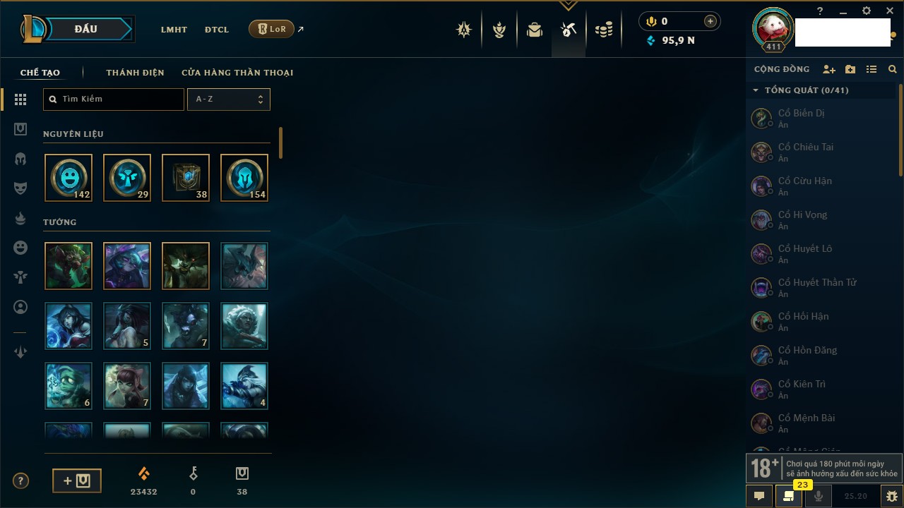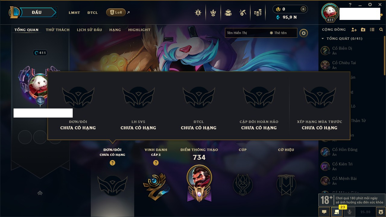 Rank Đơn: Vàng IKhung: Chưa có khungTướng: 168 - Còn 2976 THXTrang Phục: 154Rank ĐTCL: Chưa RankLinh Thú: 81