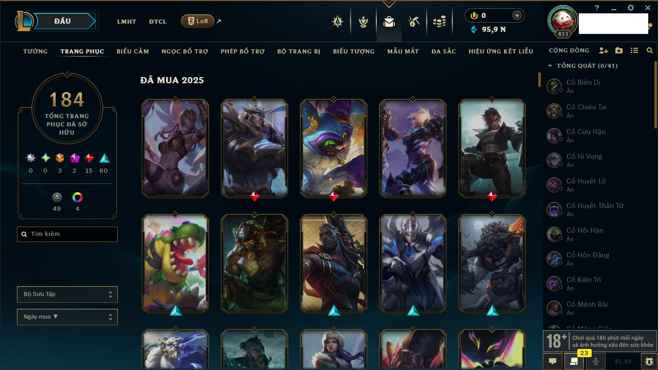 Rank Đơn: Vàng IIIKhung: VàngTướng: 171 - Còn 119894 THXTrang Phục: 108Rank ĐTCL: Lục Bảo IVLinh Thú: 94