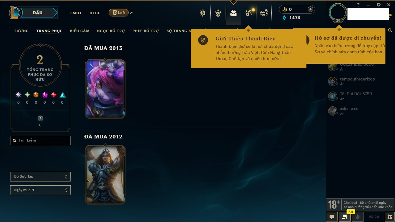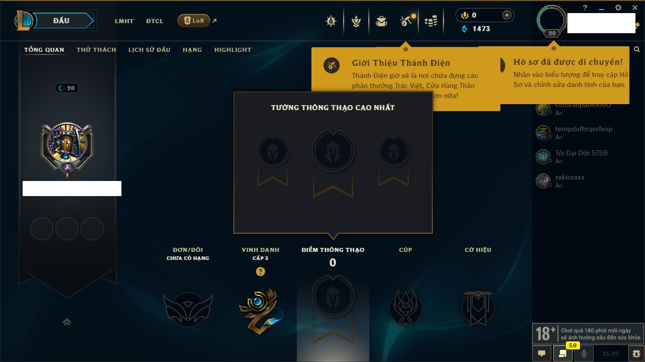 Rank Đơn: Vàng IVKhung: BạcTướng: 166 - Còn 180925 THXTrang Phục: 163Rank ĐTCL: Chưa RankLinh Thú: 67