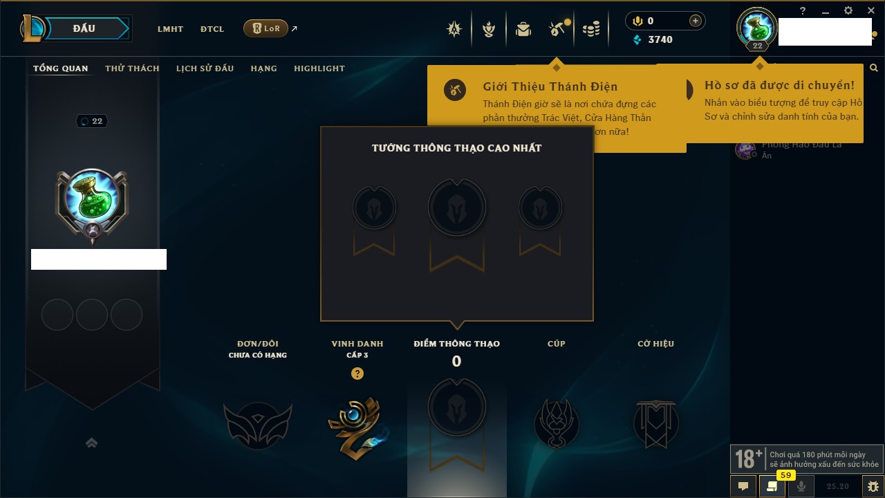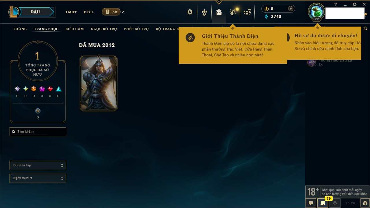 Rank Đơn: Vàng IVKhung: BạcTướng: 166 - Còn 180925 THXTrang Phục: 163Rank ĐTCL: Chưa RankLinh Thú: 67