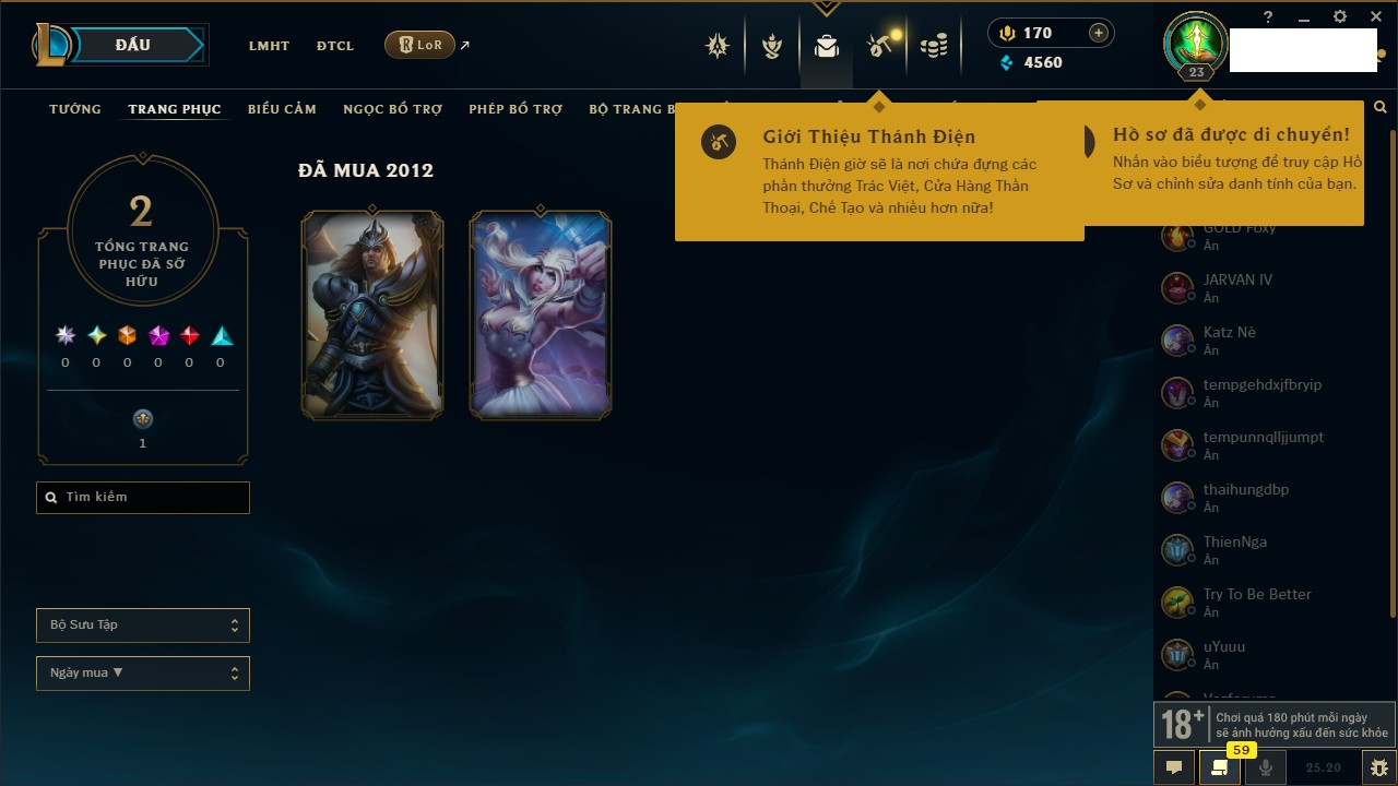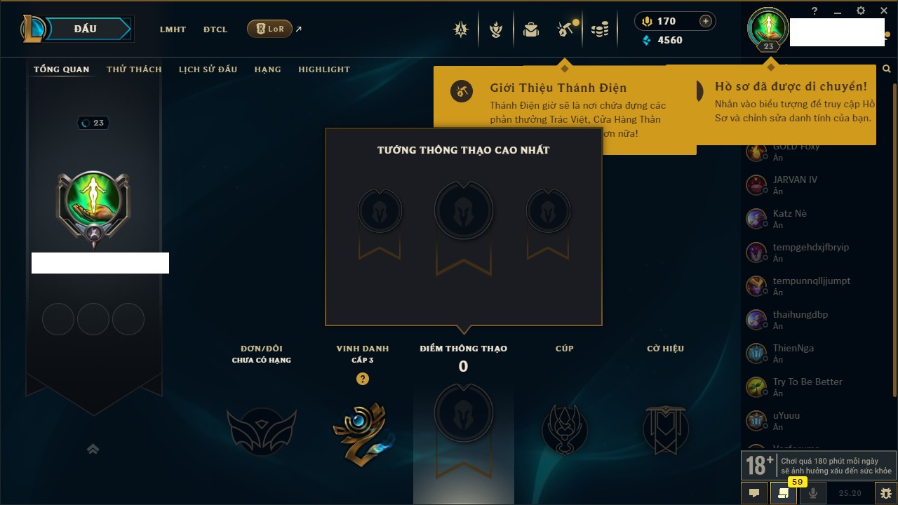 Rank Đơn: Bạc IVKhung: VàngTướng: 172 - Còn 358384 THXTrang Phục: 177Rank ĐTCL: Lục Bảo IILinh Thú: 211