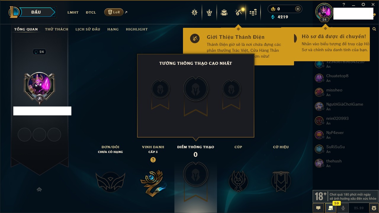 Rank Đơn: Bạc IIKhung: VàngTướng: 171 - Còn 332462 THXTrang Phục: 165Rank ĐTCL: Kim Cương IVLinh Thú: 181