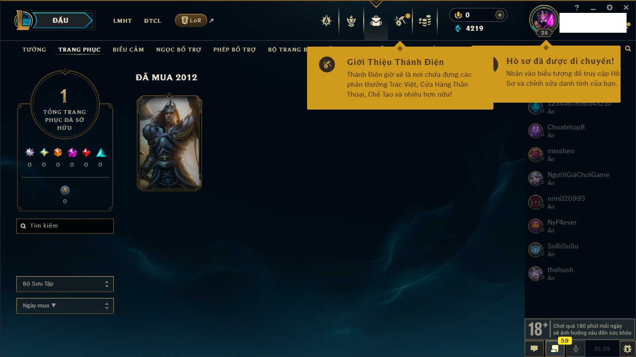 Rank Đơn: Vàng IVKhung: VàngTướng: 171 - Còn 48721 THXTrang Phục: 171Rank ĐTCL: Chưa RankLinh Thú: 27