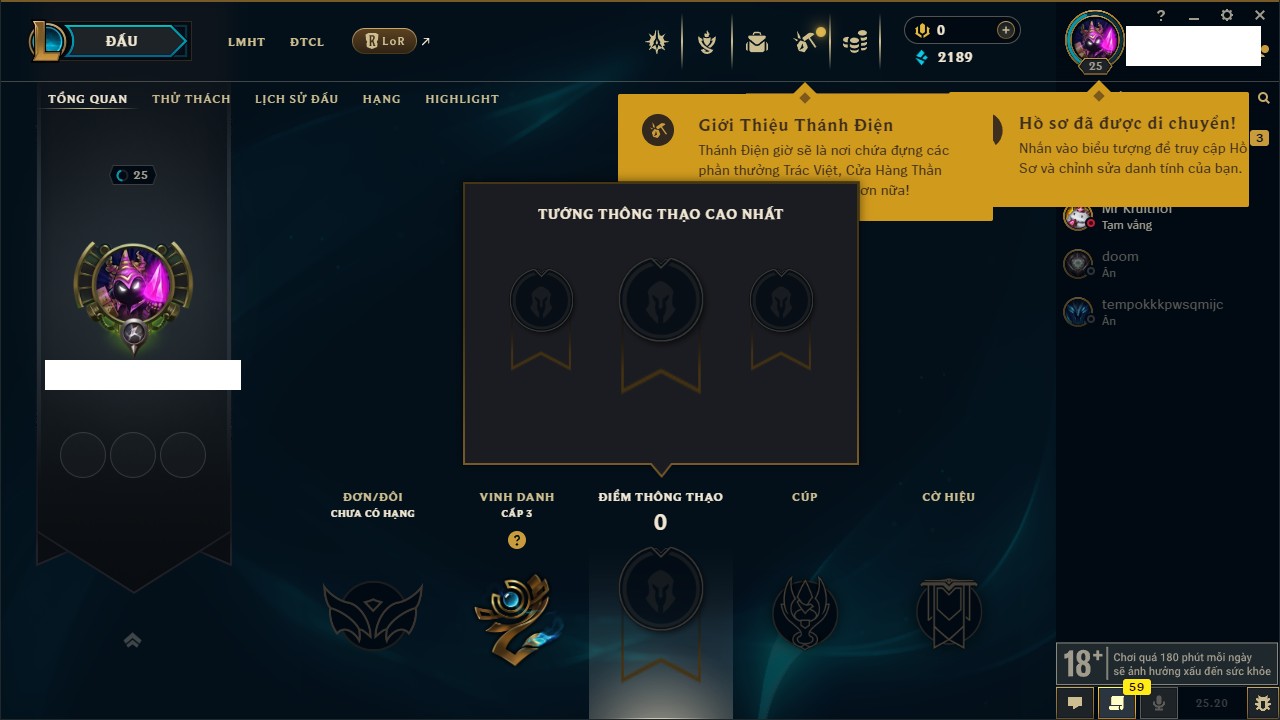 Rank Đơn: Bạc IIKhung: VàngTướng: 171 - Còn 332462 THXTrang Phục: 165Rank ĐTCL: Kim Cương IVLinh Thú: 181
