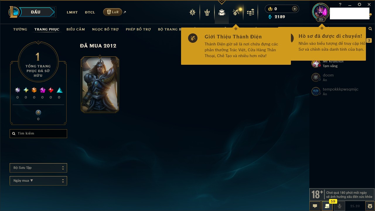 Rank Đơn: Vàng IVKhung: VàngTướng: 171 - Còn 48721 THXTrang Phục: 171Rank ĐTCL: Chưa RankLinh Thú: 27