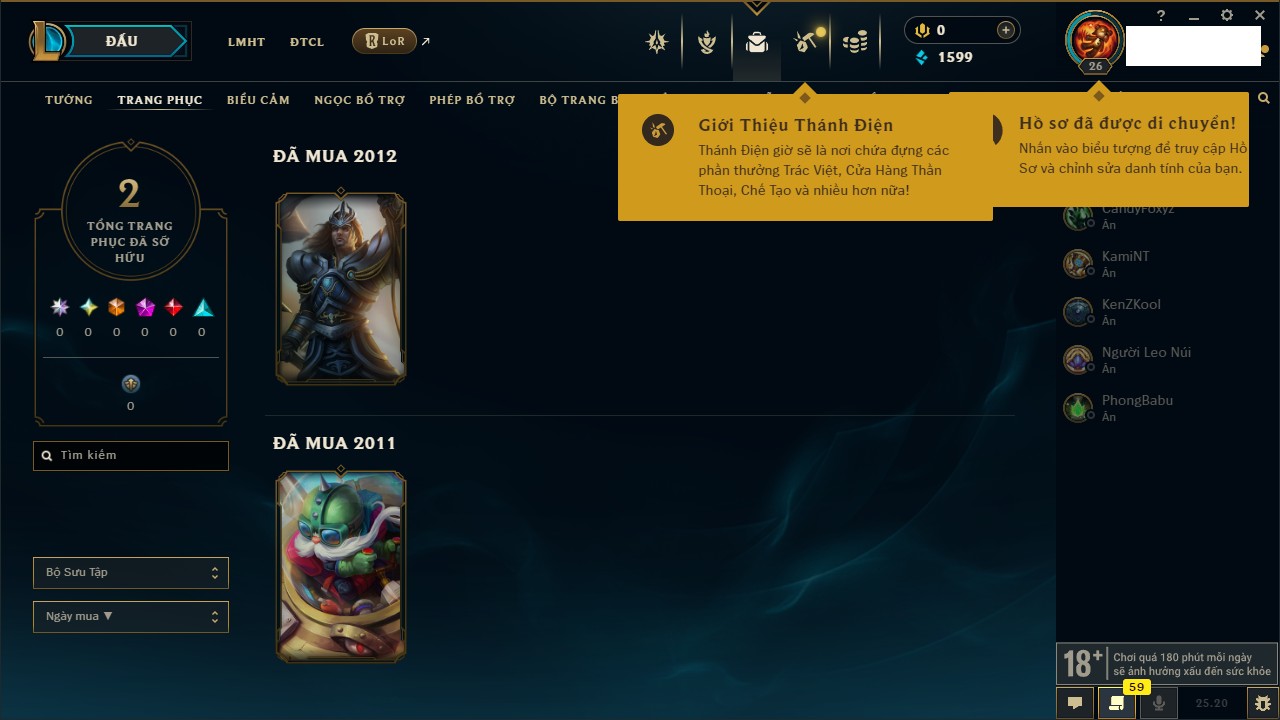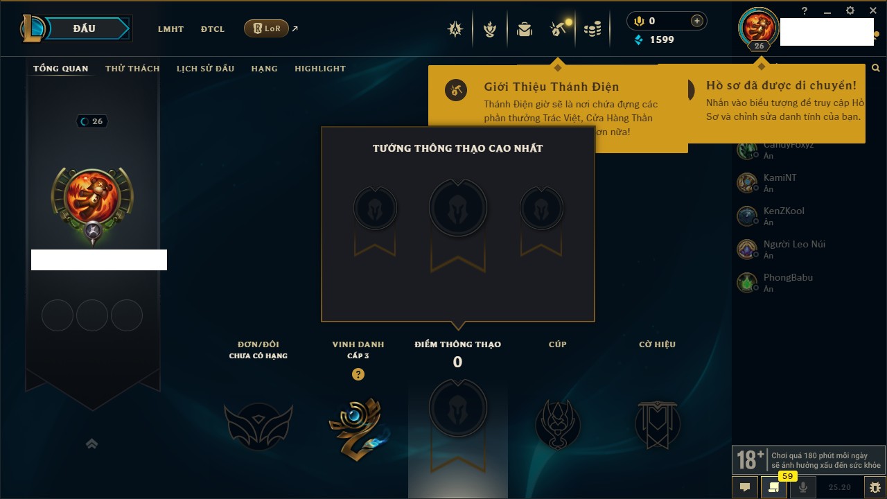 Rank Đơn: Vàng IVKhung: BạcTướng: 166 - Còn 180925 THXTrang Phục: 163Rank ĐTCL: Chưa RankLinh Thú: 67