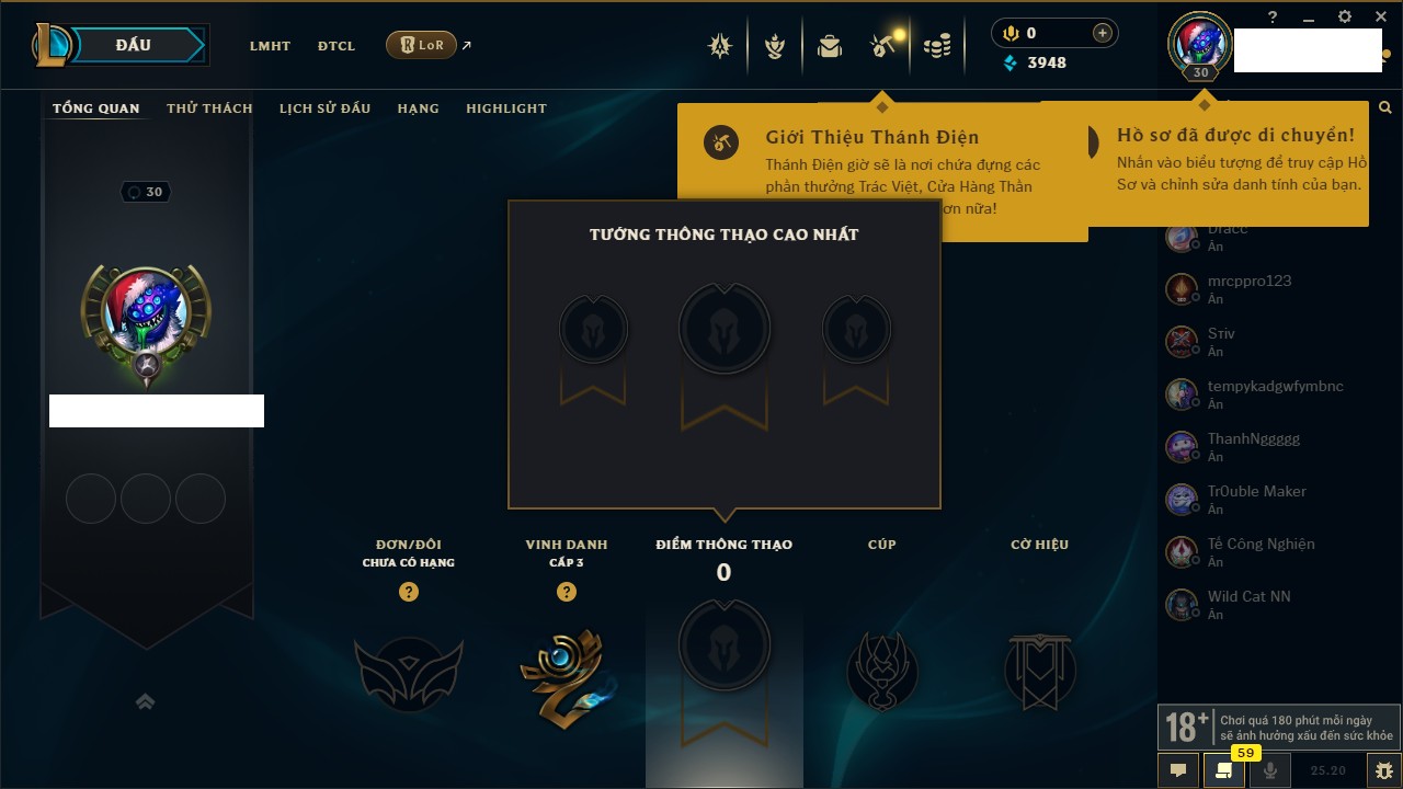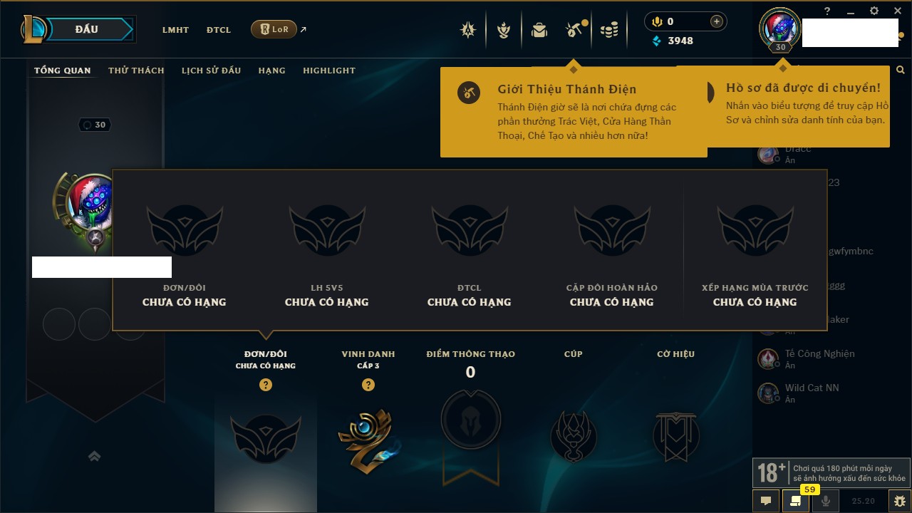 Rank Đơn: Chưa RankKhung: Chưa có khungTướng: 157 - Còn 6783 THXTrang Phục: 50Rank ĐTCL: Chưa RankLinh Thú: 37