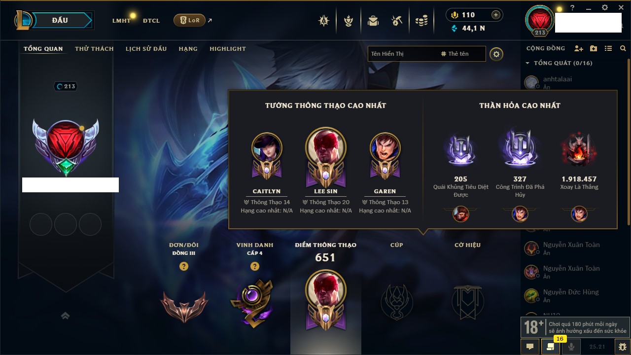 Rank Đơn: Bạch Kim IIKhung: Bạch kimTướng: 171 - Còn 97913 THXTrang Phục: 261Rank ĐTCL: Chưa RankLinh Thú: 46