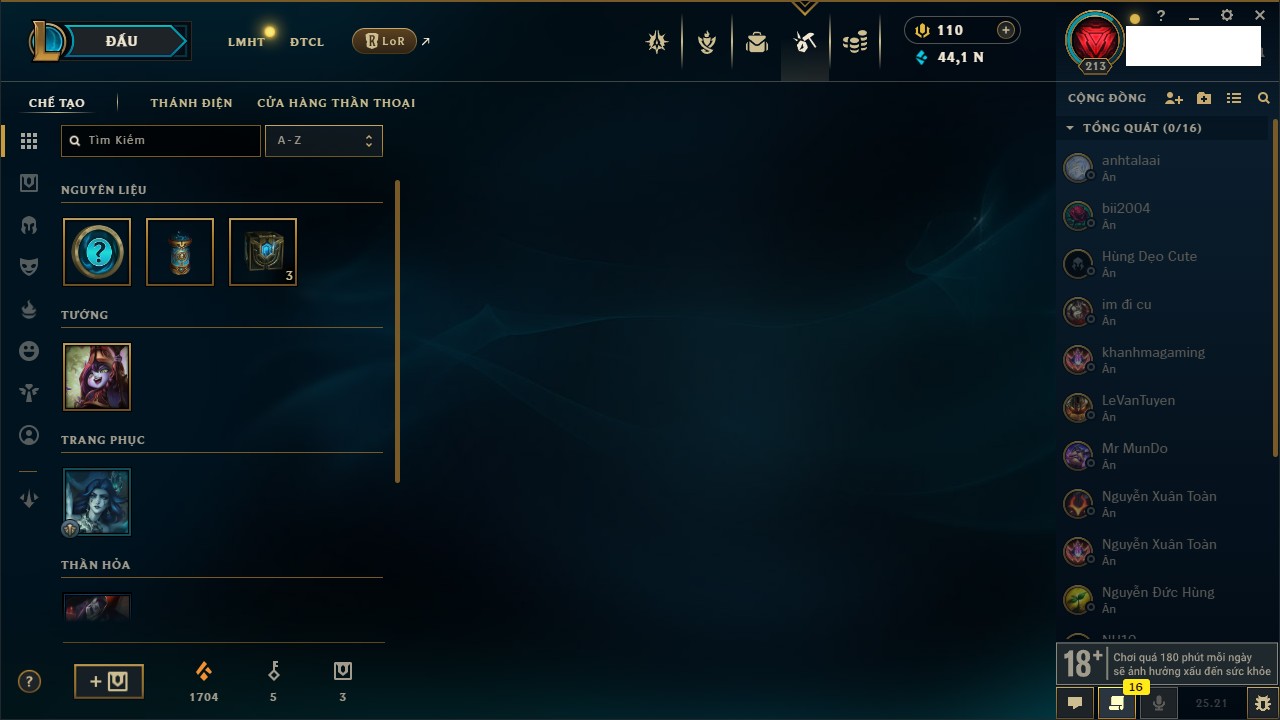 Rank Đơn: Bạc IIIKhung: BạcTướng: 171 - Còn 190352 THXTrang Phục: 260Rank ĐTCL: Sắt IILinh Thú: 31