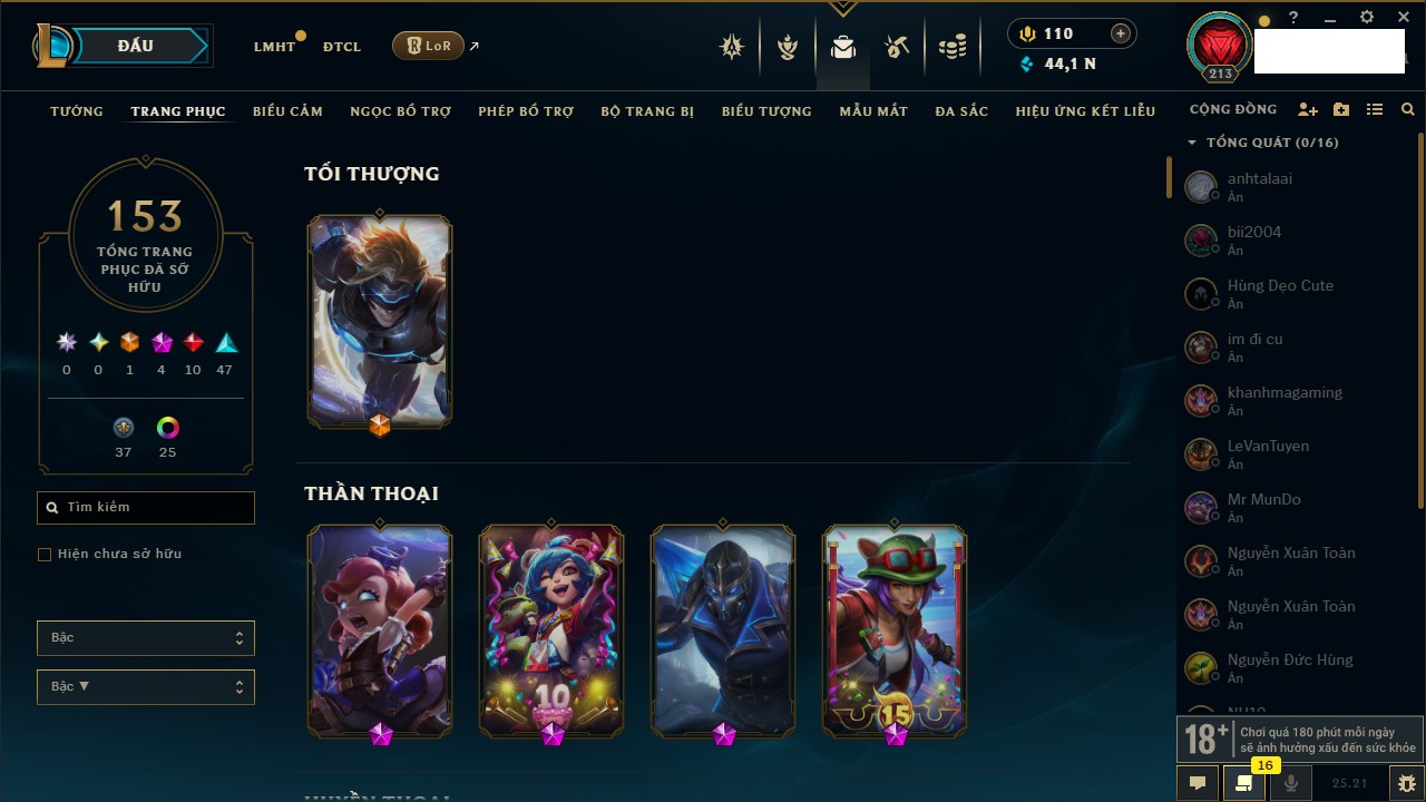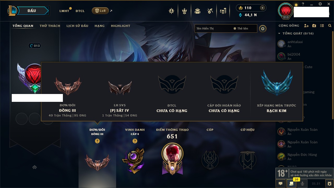 Rank Đơn: Bạch Kim IIKhung: Bạch kimTướng: 171 - Còn 316137 THXTrang Phục: 89Rank ĐTCL: Bạch Kim IIILinh Thú: 94