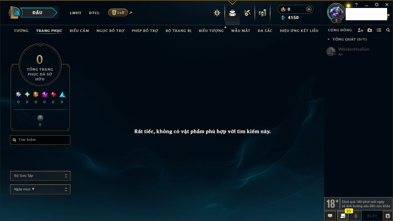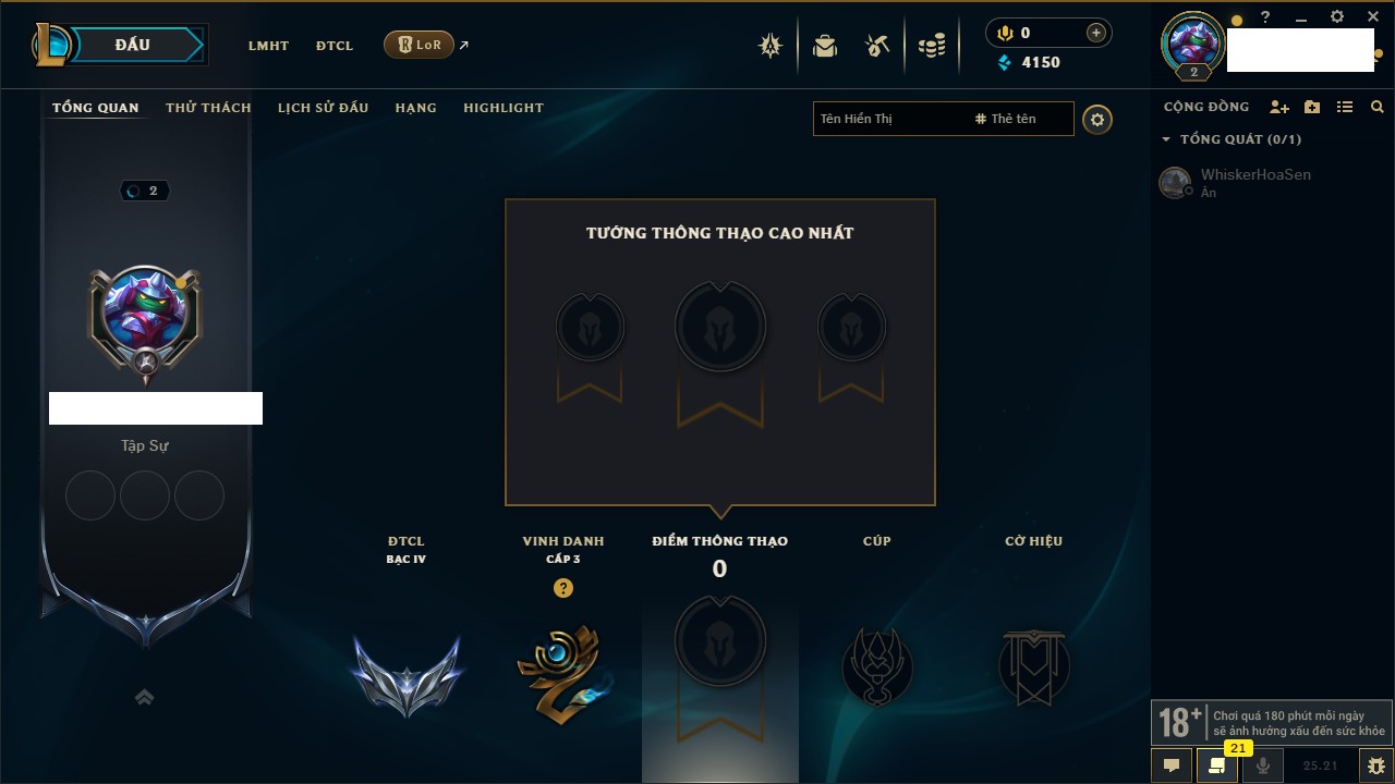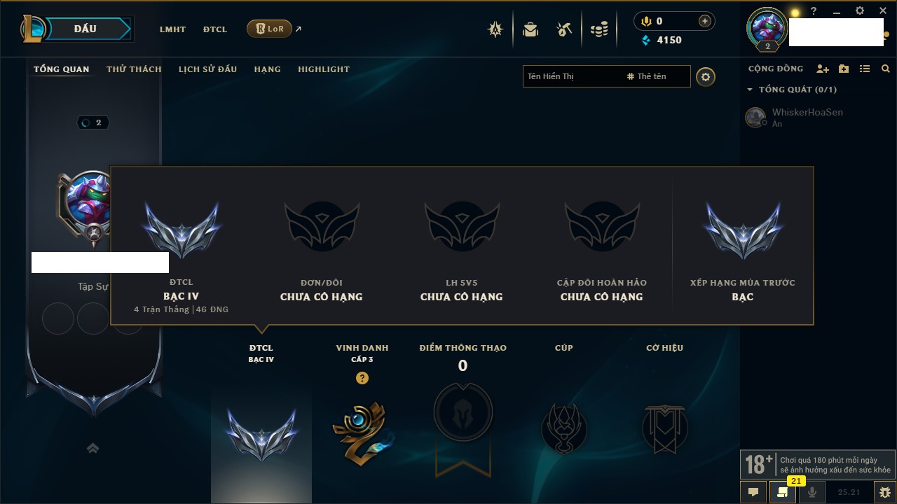 Rank Đơn: Chưa RankKhung: Chưa có khungTướng: 165 - Còn 3214 THXTrang Phục: 160Rank ĐTCL: Chưa RankLinh Thú: 28