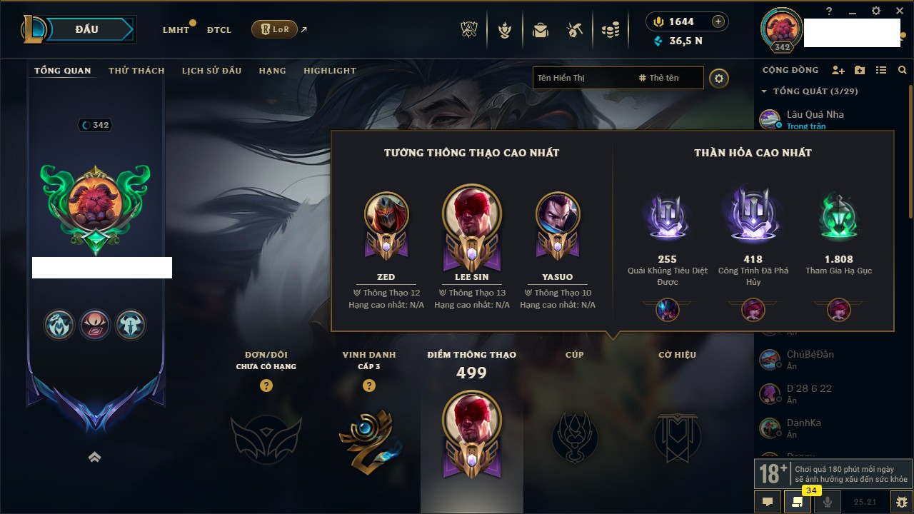 Rank Đơn: Chưa RankKhung: Chưa có khungTướng: 165 - Còn 1609 THXTrang Phục: 25Rank ĐTCL: Chưa RankLinh Thú: 44