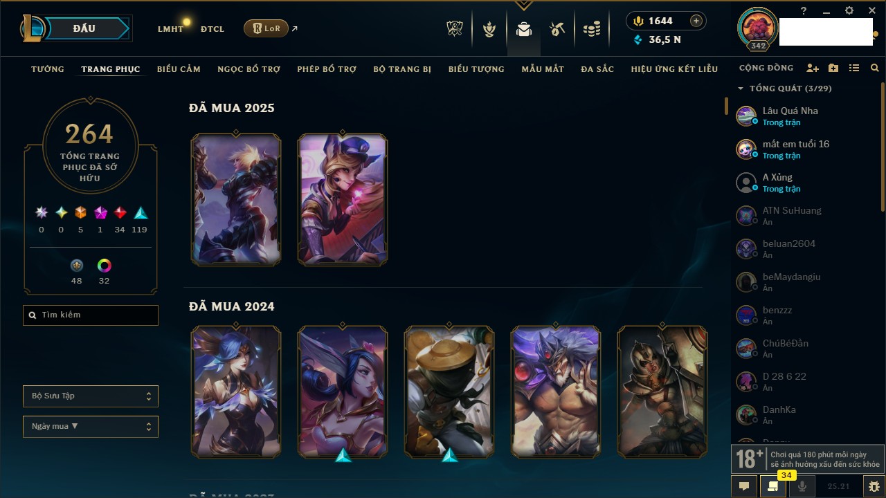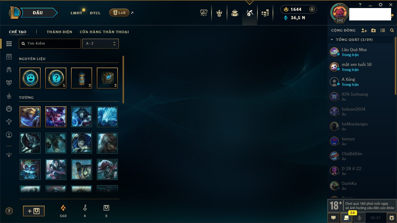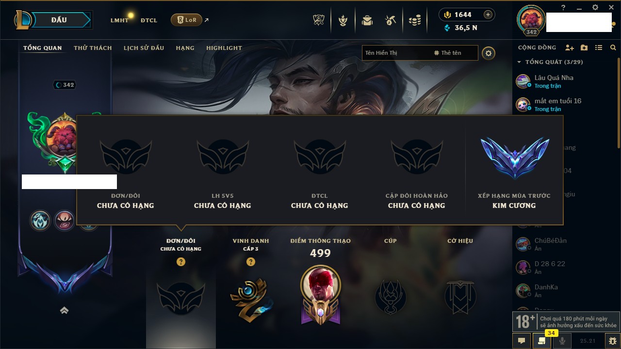 Rank Đơn: Bạc IIKhung: Bạch kimTướng: 169 - Còn 81813 THXTrang Phục: 301Rank ĐTCL: Chưa RankLinh Thú: 140
