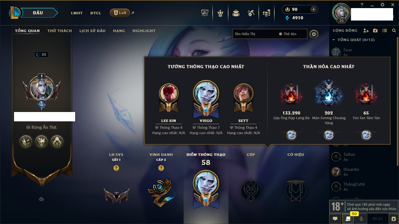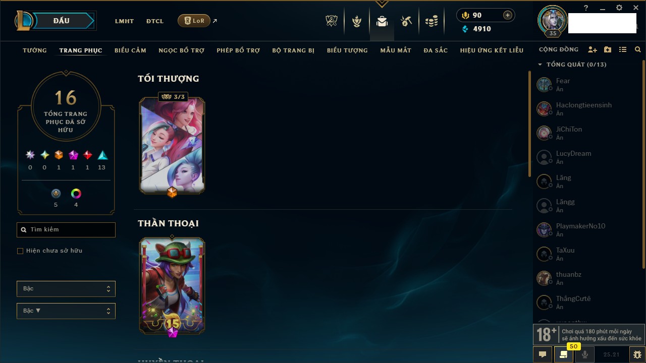 Rank Đơn: Bạch Kim IIKhung: Bạch kimTướng: 171 - Còn 316137 THXTrang Phục: 89Rank ĐTCL: Bạch Kim IIILinh Thú: 94