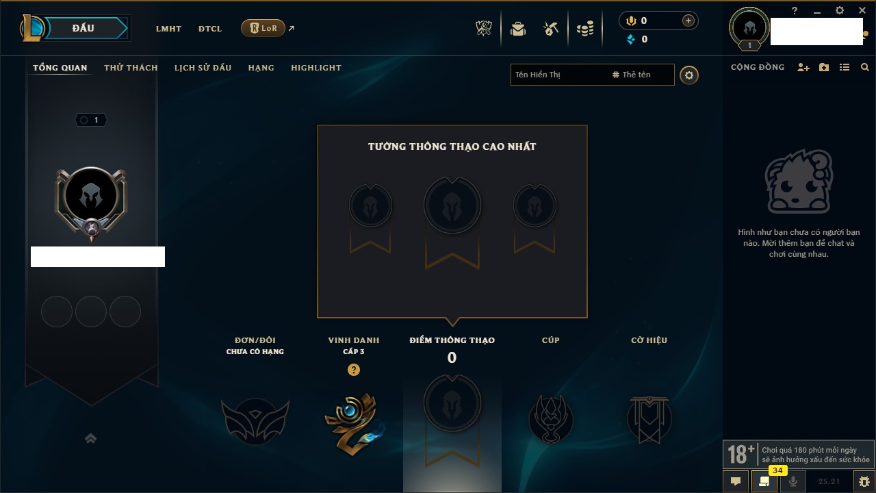 Rank Đơn: Vàng IKhung: BạcTướng: 171 - Còn 60584 THXTrang Phục: 286Rank ĐTCL: Vàng IIILinh Thú: 117