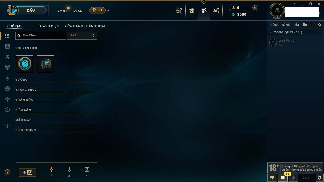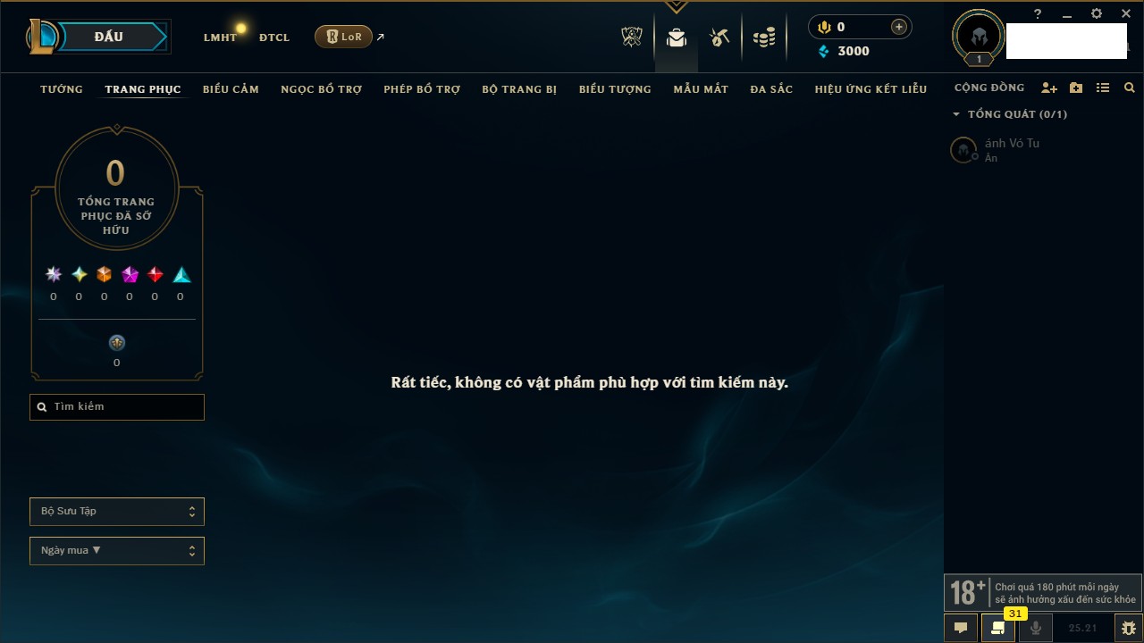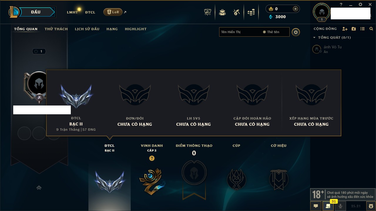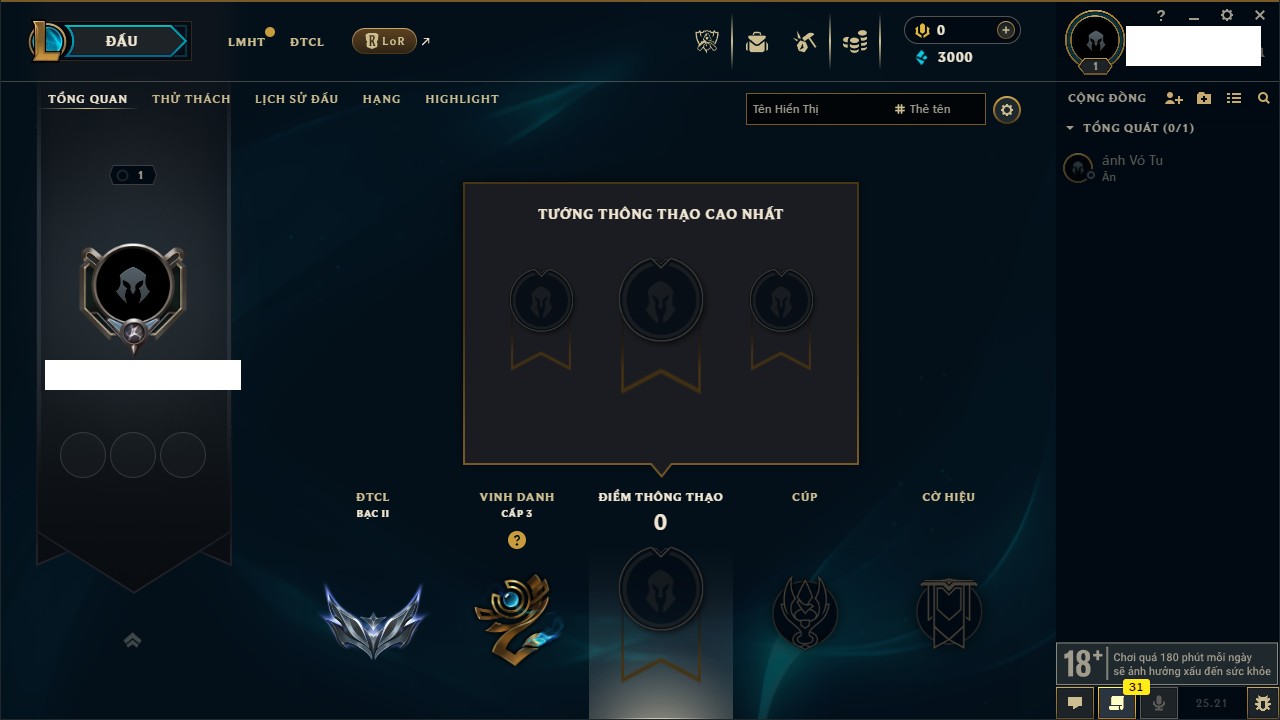 Rank Đơn: Chưa rank mùa nàoKhung: Chưa có khungTướng: 1 - Còn 3000 THXTrang Phục: 0Rank ĐTCL: Vàng ILinh Thú: 6