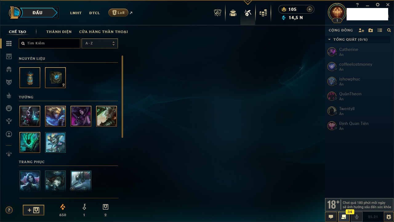 Rank Đơn: Chưa rank mùa nào Khung: Chưa có khung Tướng: 56 - Còn 2186 THX Trang Phục: 1 Rank ĐTCL: Chưa Rank Linh Thú: 25