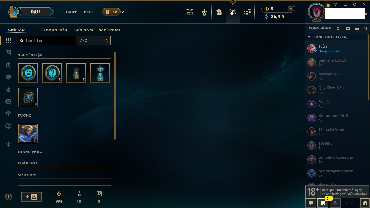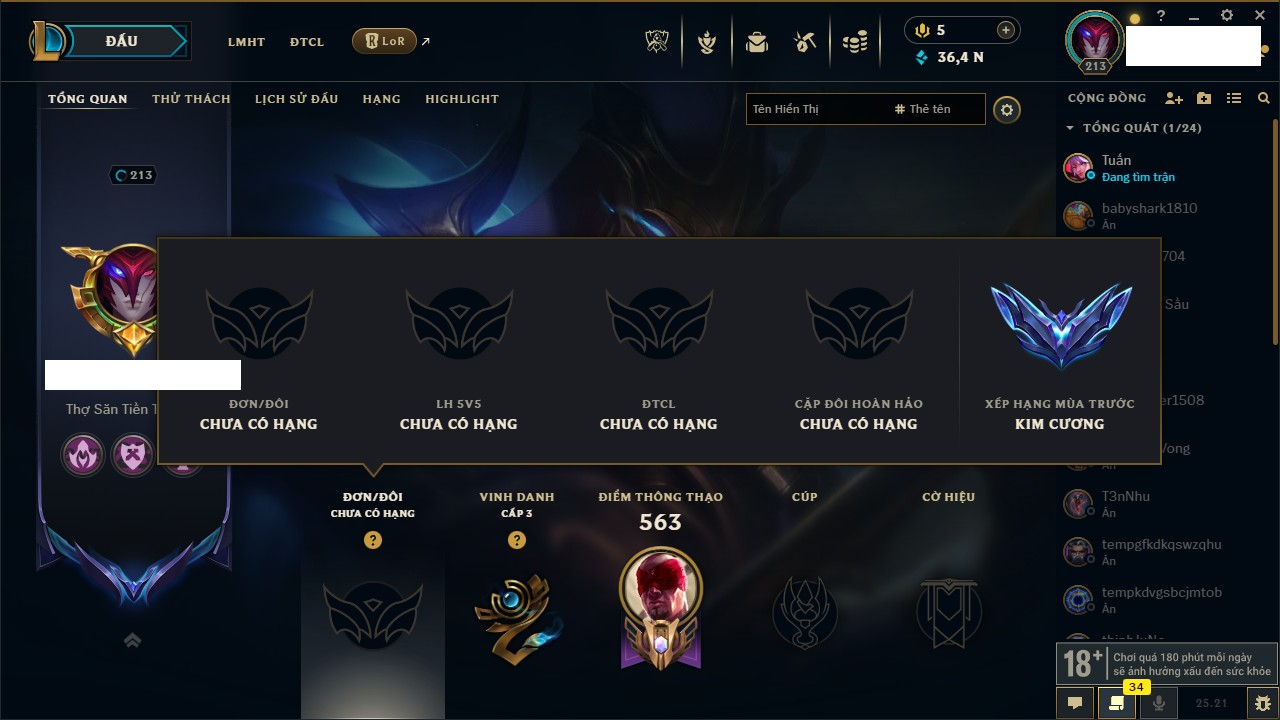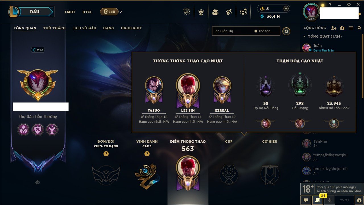 Rank Đơn: Vàng IIIKhung: BạcTướng: 171 - Còn 101359 THXTrang Phục: 88Rank ĐTCL: Kim Cương IVLinh Thú: 200