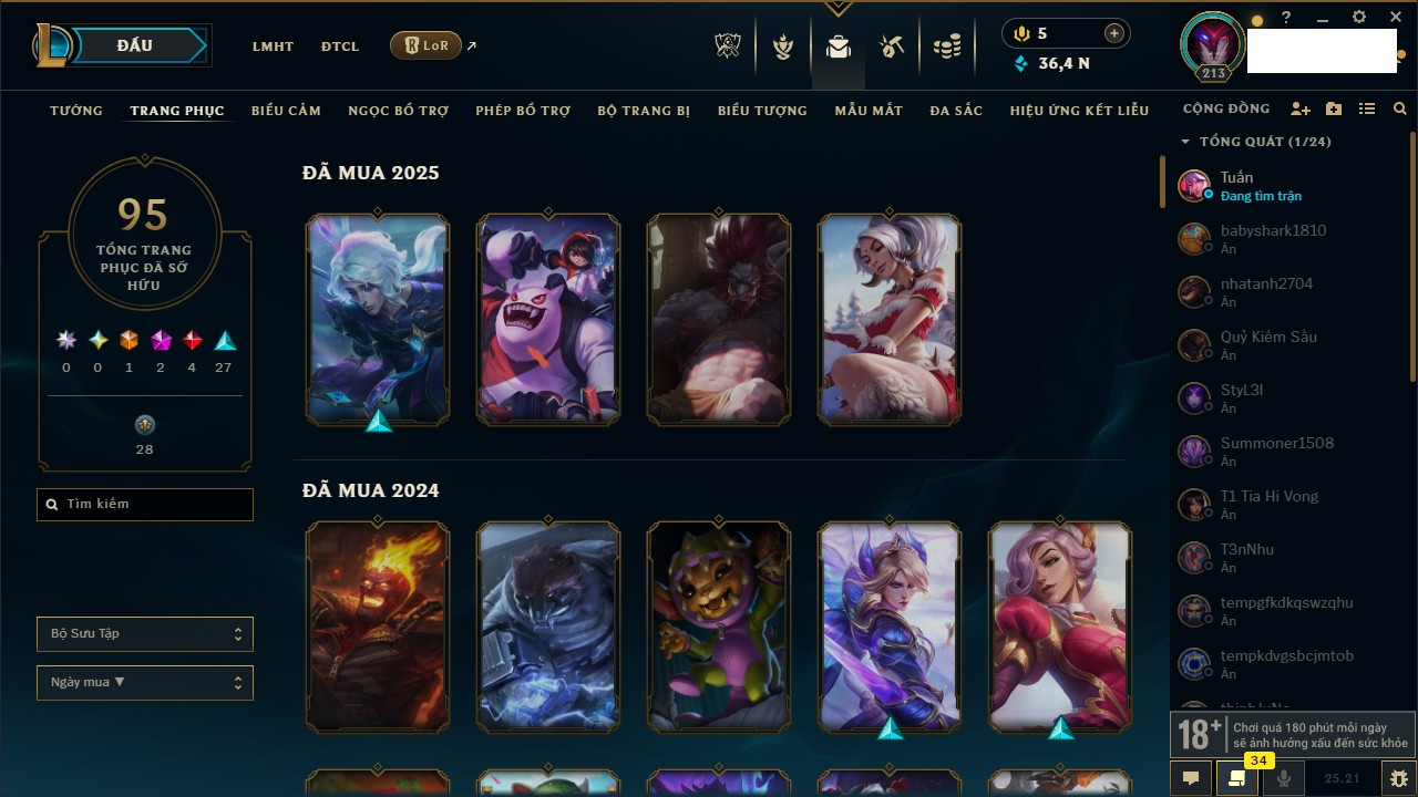 Rank Đơn: Đồng IIKhung: ĐồngTướng: 170 - Còn 66145 THXTrang Phục: 215Rank ĐTCL: Chưa RankLinh Thú: 52