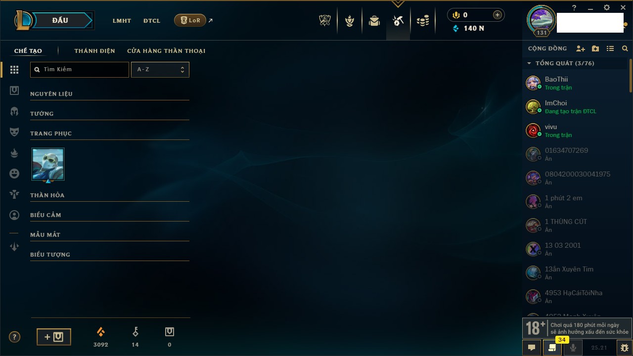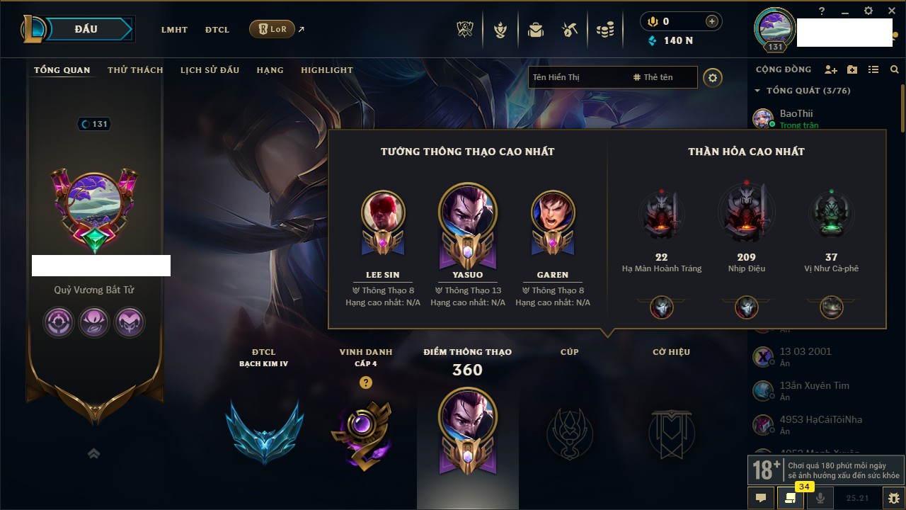 Rank Đơn: Vàng IVKhung: BạcTướng: 171 - Còn 231097 THXTrang Phục: 180Rank ĐTCL: Vàng IVLinh Thú: 110