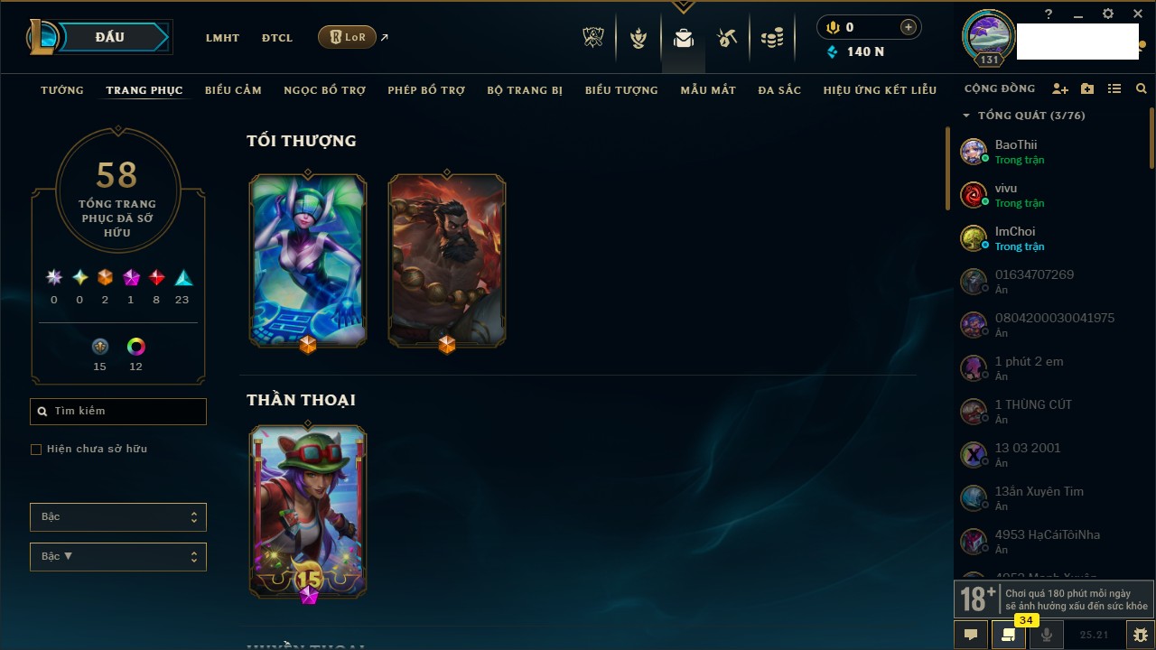 Rank Đơn: Vàng IVKhung: BạcTướng: 166 - Còn 180925 THXTrang Phục: 163Rank ĐTCL: Chưa RankLinh Thú: 67