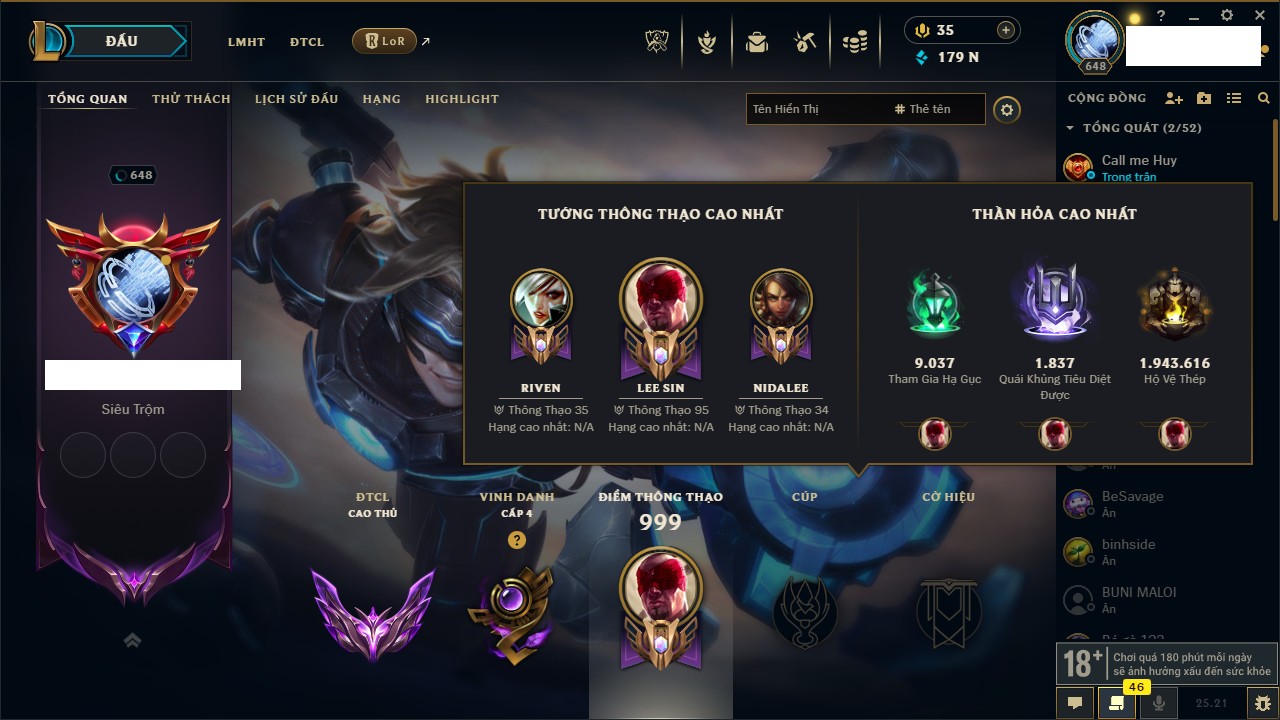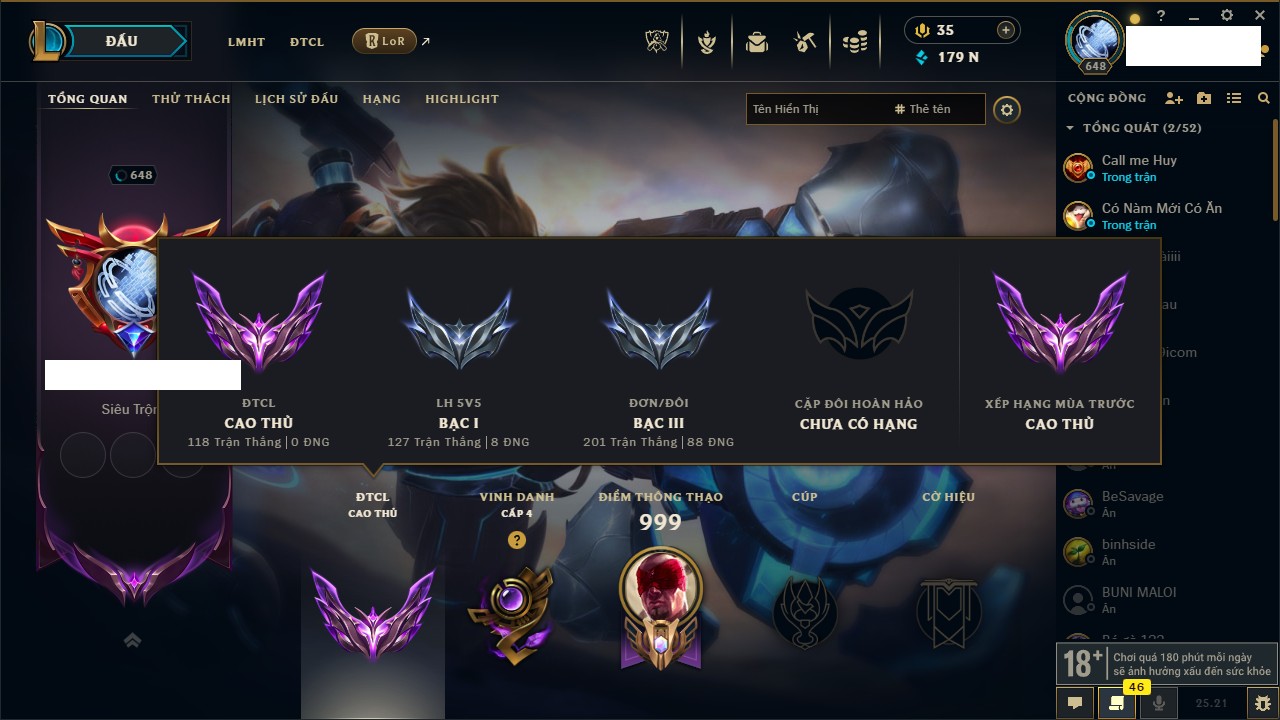 Rank Đơn: Vàng IKhung: BạcTướng: 171 - Còn 60584 THXTrang Phục: 286Rank ĐTCL: Vàng IIILinh Thú: 117