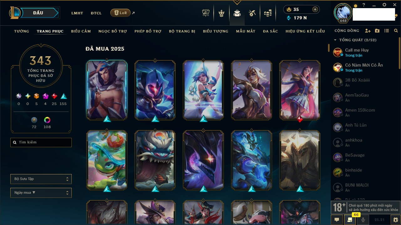 Rank Đơn: Vàng IIIKhung: VàngTướng: 171 - Còn 88128 THXTrang Phục: 329Rank ĐTCL: Chưa RankLinh Thú: 41