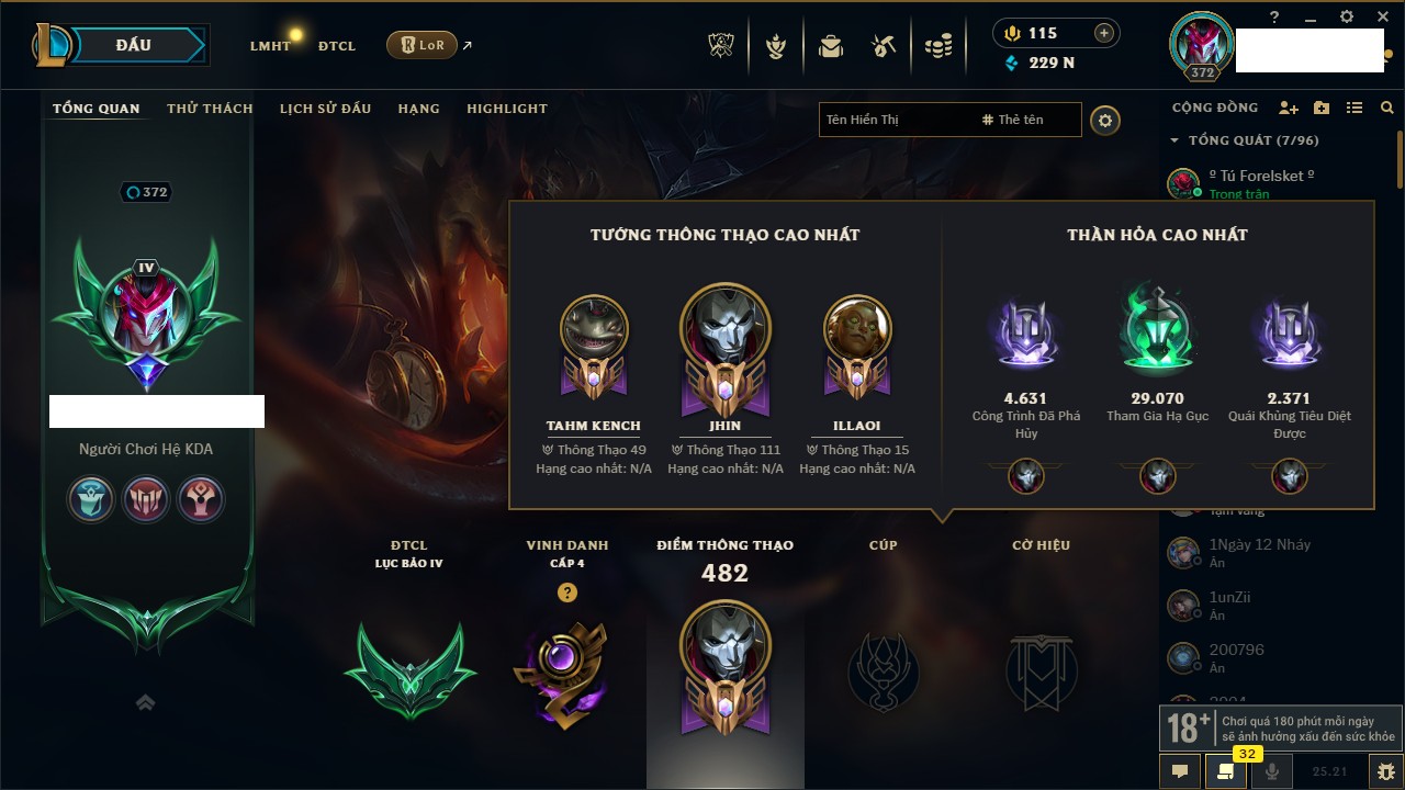 Rank Đơn: Bạch Kim IVKhung: Bạch kimTướng: 171 - Còn 54021 THXTrang Phục: 327Rank ĐTCL: Chưa RankLinh Thú: 115
